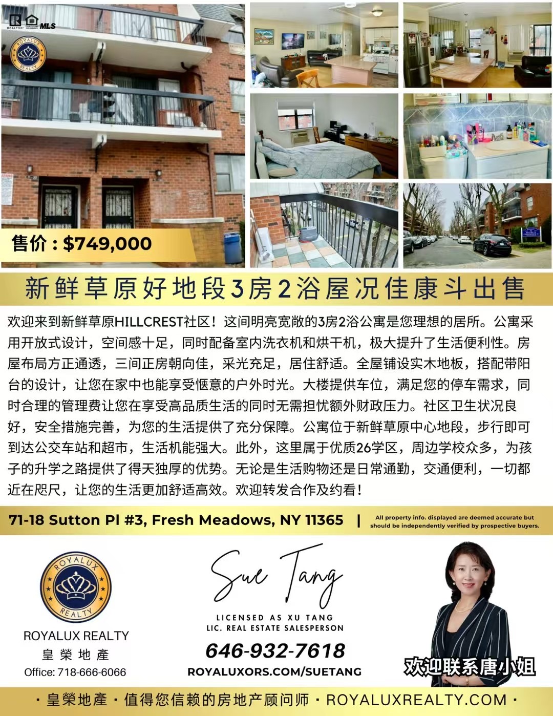 欢迎来到新鲜草原HILLCREST社区!这间明亮宽敞的3房2浴公寓是您理想的居所。公寓采用开放式设计,空间感十足,同时配备室内洗衣机和烘干机,极大提升了生活便利性。房屋布局方正通透,三间正房朝向佳,采光充足,居住舒适。全屋铺设实木地板,搭配带阳台的设计,让您在家中也能享受惬意的户外时光。大楼提供车位,满足您的停车需求,同时合理的管理费让您在享受高品质生活的同时无需担忧额外财政压力。社区卫生状况良好,安全措施完善,为您的生活提供了充分保障。公寓位于新鲜草原中心地段,步行即可到达公交车站和超市,生活机能强大。此外,这里属于优质26学区,周边学校众多,为孩子的升学之路提供了得天独厚的优势。无论是生活购物还是日常通勤,交通便利,一切都近在咫尺,让您的生活更加舒适高效。