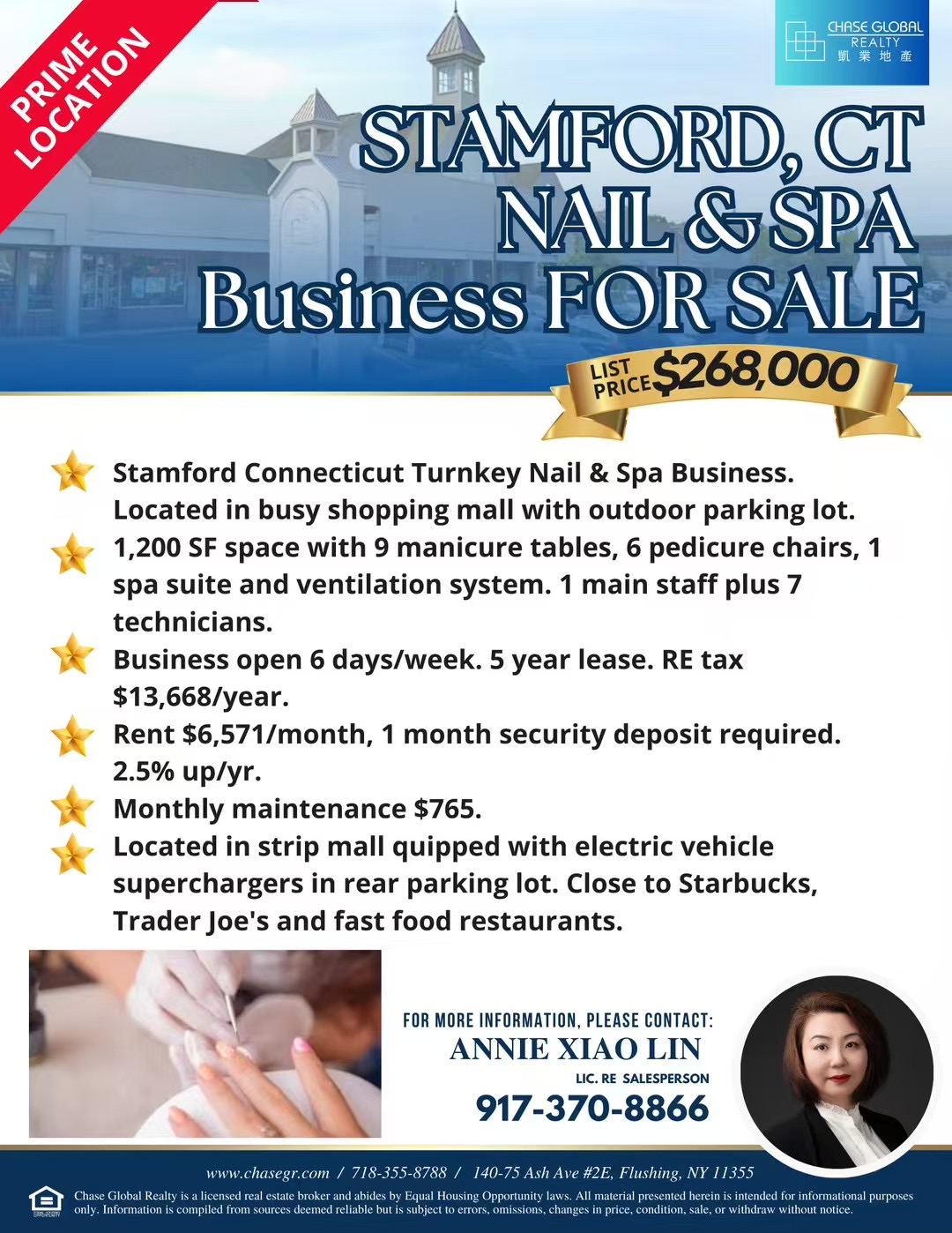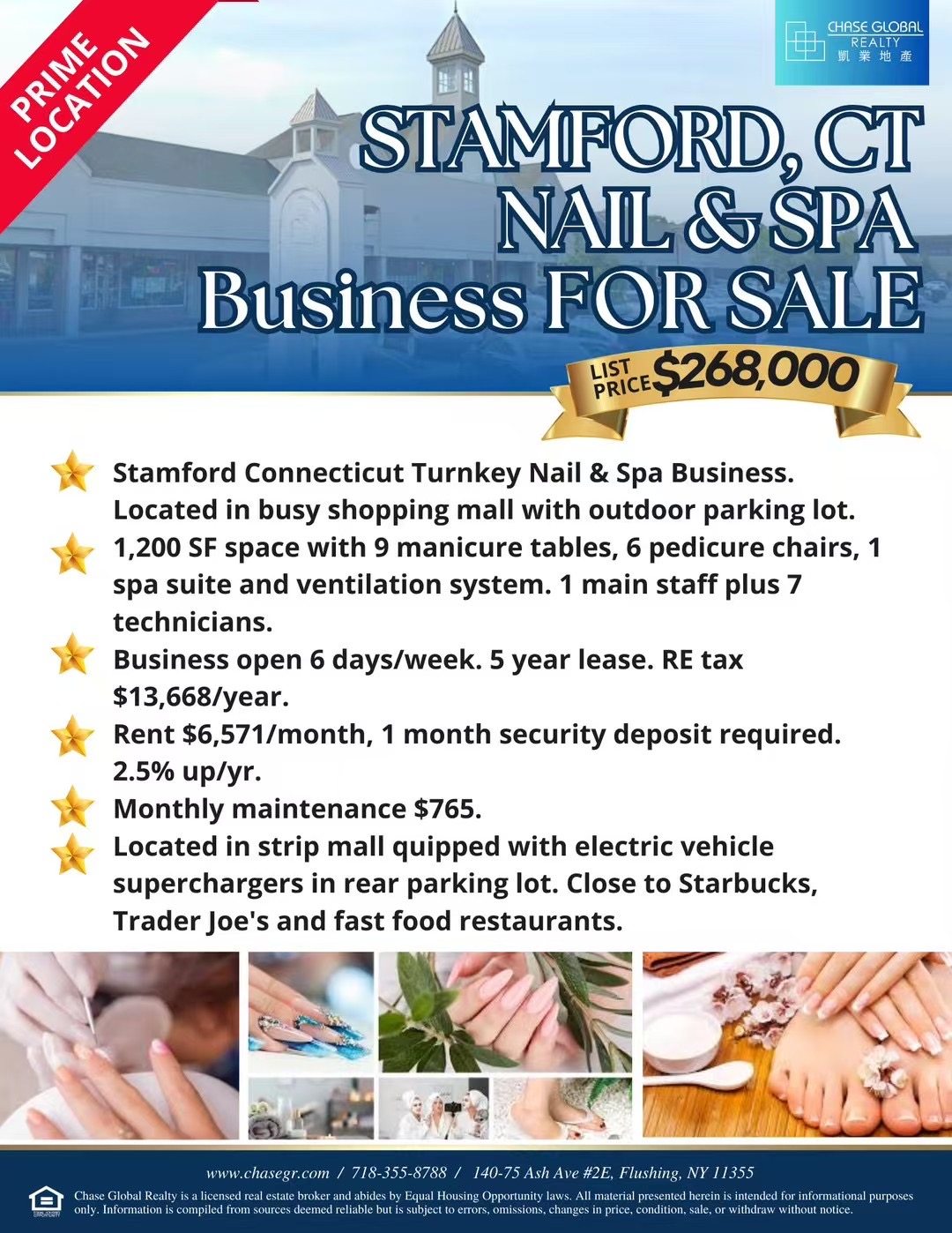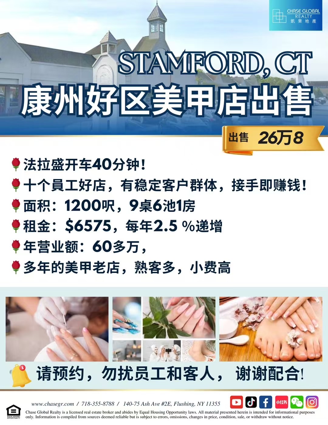 🔥【Stamford, CT 美甲&水疗生意转让】🔥📍 位置:Stamford, Connecticut💲 售价: $268,000
