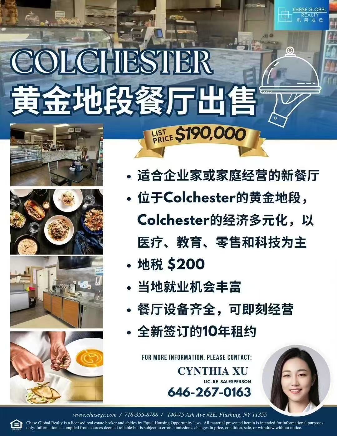 🔥 凯业地产Colchester黄金地段餐厅出售 🔥💰 售价仅$190,000📍 S Main Street, Colchester, CT 06415 USA🔹 适合企业家或家庭经营的全新餐厅🔹 年地税仅$200🔸 餐厅设备齐全,接手即可运营🔹 刚签订的10年稳定租约🔸 餐厅位于Colchester黄金地段,周边经济多元,涵盖医疗、教育、零售和科技产业,提供丰富就业机会📞 欢迎合作!预约看店请联系: