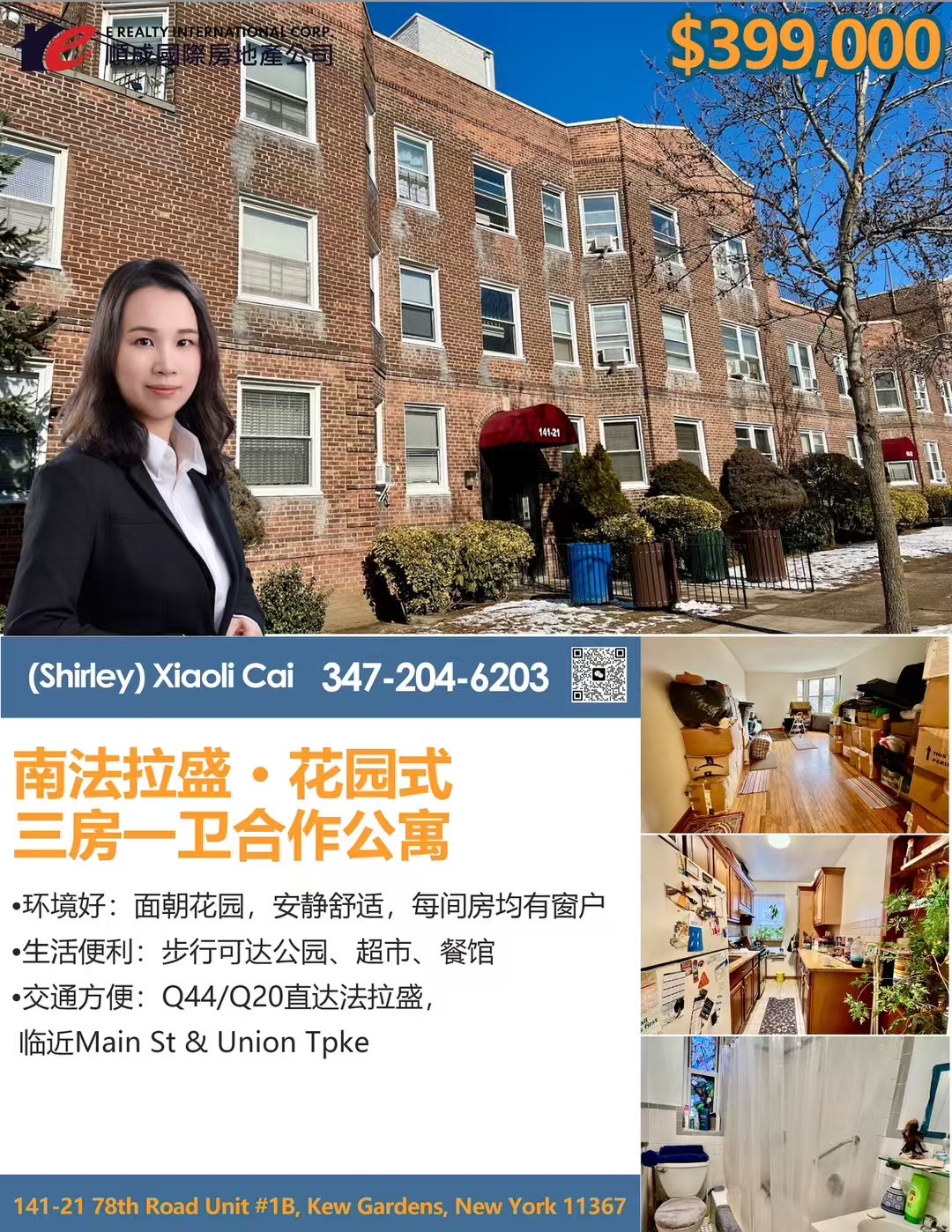 法拉盛房屋出售欢迎合作!南法拉盛合作公寓三房一卫,面朝花园,安静舒适! 交通便利,临近缅街和Union Turnpike。有直达法拉盛和曼哈顿的Bus。附近有超市,餐馆和公园。社区安静。投资自住好选择。维持费每月1096!