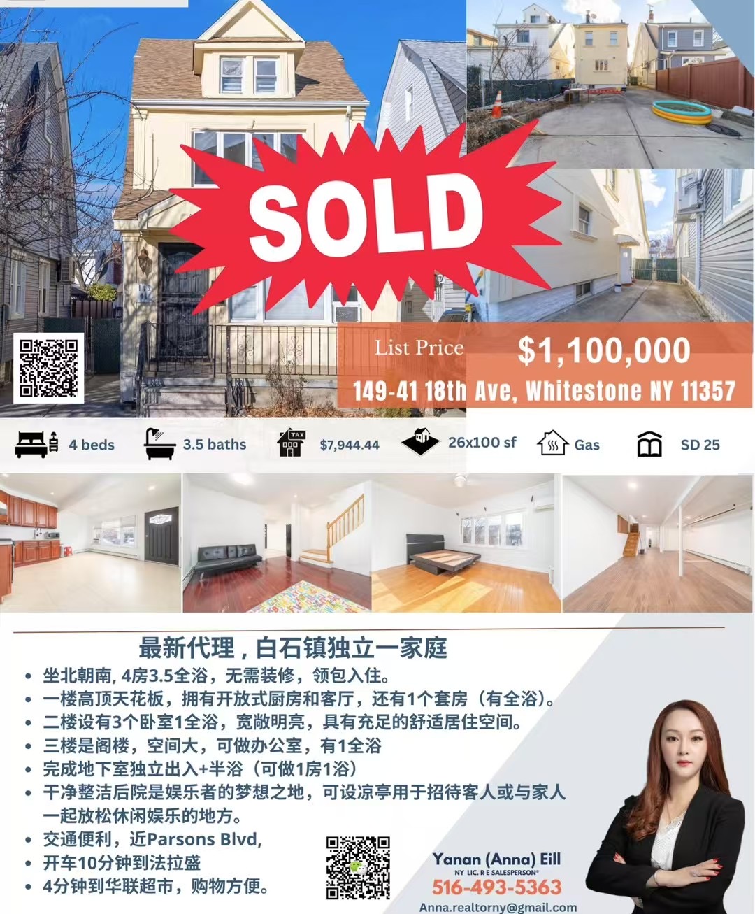 纽约华人地产经纪 纽约房地产经纪人 纽约商业地产经纪 曼哈顿金牌经纪人纽约华人地产公司纽约高端经验地产经纪 🥳仅一次公展就找到了诚意买家💪顺利过户了[跳跳]感谢屋主和买家的信任与支持🙏我继续努力💪需要买房、卖房请联系Anna 团队诚信.专业.资深地产经纪独家房源.大量现金买家.快速过户☎️ 516-493-5363 Anna 钱小姐