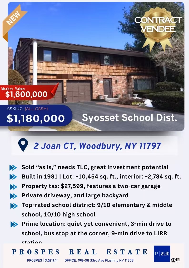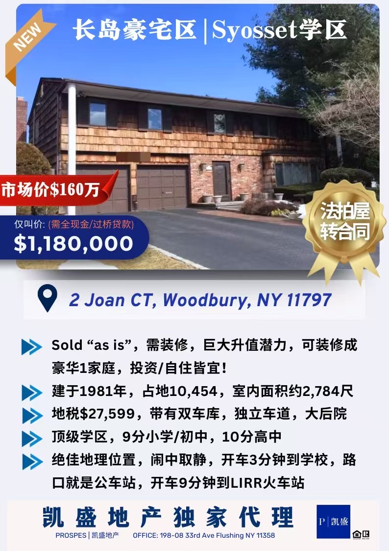 💥Woodbury伍德伯里高端住宅出售 豪宅区绿化好带泳池庭院Syosset塞奥瑟高分学区豪宅出售 精装大宅近公园法拍转合同新上市💙凯盛地产💙独家代理长岛豪宅好区Woodbury|Syosset学区📍 2 Joan Ct, Woodbury, NY 11797💰 仅叫价:$1,180,000(需全现金/过桥贷款)🧧市场价:$1,600,000🏡 Sold "as is",需装修,巨大升值潜力!✨ 可升级为豪华独立屋,投资/自住皆宜!📏 建于1981年,占地10,454尺,室内约2,784尺💲 地税:$27,599🚗 双车库 + 独立车道 + 大后院🏫 顶级学区:9分小学/初中,10分高中📍 绝佳地理位置:✅ 闹中取静,生活便利