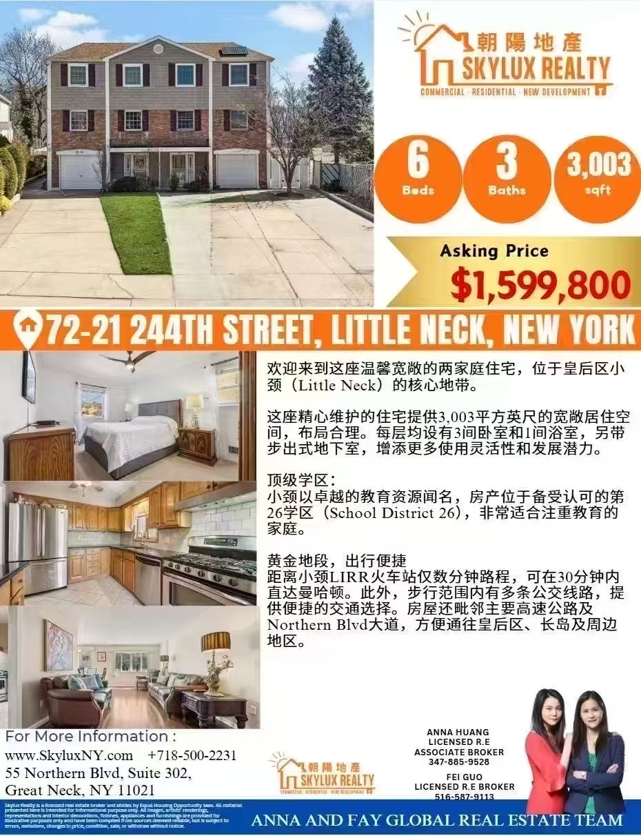 小颈房子出售 Little Neck NY 学区房精选,新上市小颈豪宅、住宅别墅买卖全覆盖🆕最新上市 需要預約👏👏小頸大型2家庭🏠 🔥難得Queens26學區9分學區🔥6臥 3浴🔥地 大 20.75 X 142.5 室內 3,003 SF🔥地稅 $15,603💎位於皇后區和長島邊界的小頸市中心地帶 周圍環境安全 完美融合了郊區的寧靜與都市的便利💎頂級學校 26學區以頂尖的學校和優秀學術機會著稱 確保孩子獲得優質教育🔥私人後院戶外空間🔥專屬車庫➕車道🔥一樓 寬敞3房 1全浴🔥二樓 寬敞3房 1全浴 🔥Walk Out 地下室 獨立出入口➕1全浴🔥生活機能完善 鄰近學校 公園 餐館和購物埸所🔥便捷大眾運輸接駁 1. LIRR 2. Q30 Q36 Q46 Q76 3. 高速公路 I-495, I-295 / Northern Blvd💥超值售價 $1,599,800朝陽地产 Skylux Realty 歡迎🈴️作約看 ANNA&FAY TEAM☎️ 516-587-9113