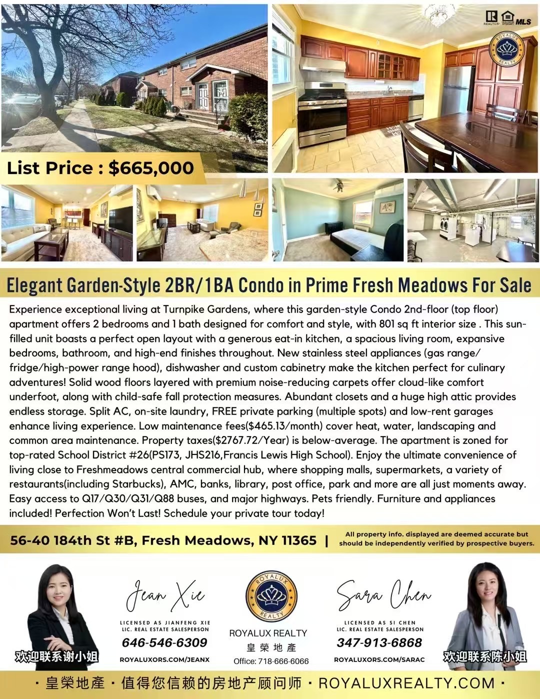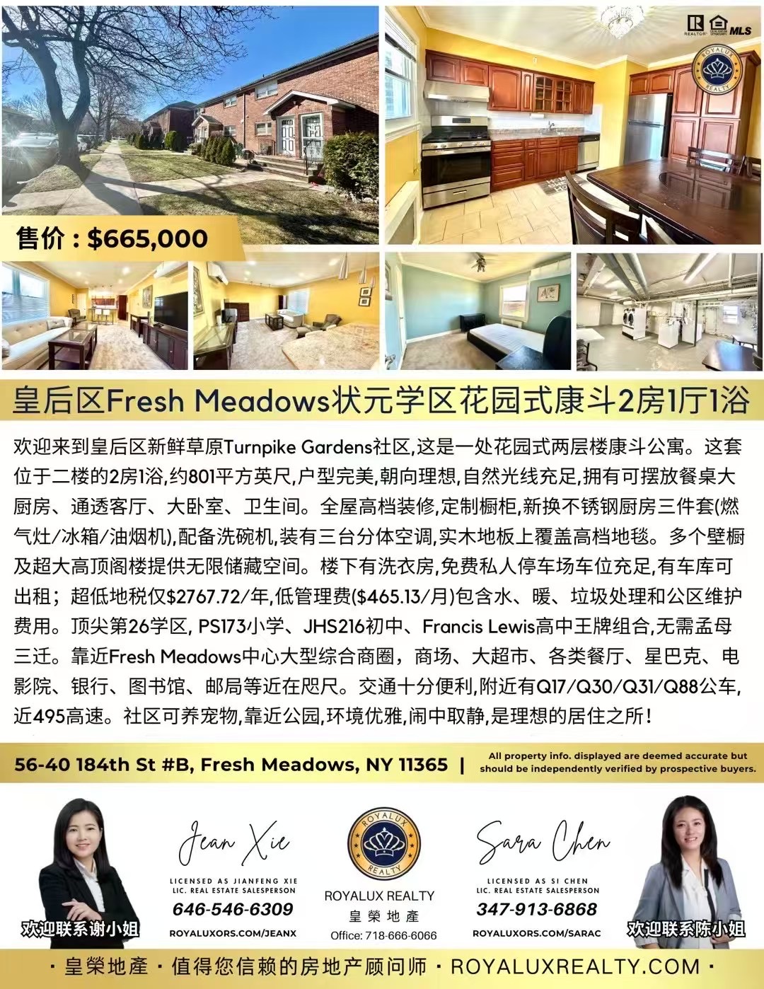 🔥新鲜草原顶尖学区花园式精装康斗两房开价$66万5🔥 地址:56-40 184th Street, Fresh Meadows, NY 11365