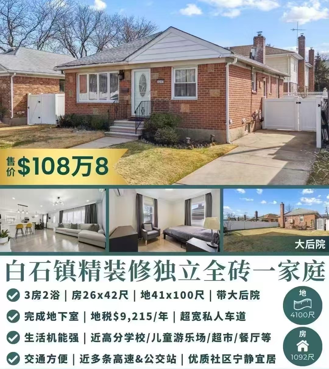 白石镇一家庭独立屋出售 安静社区 近公园学区 自住优选Whitestone一家庭住宅出售 满五唯一 全砖结构 房东诚意出售明天看👀 欢迎报名👏