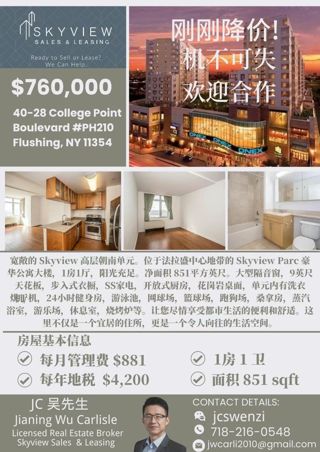 2025纽约法拉盛全新楼盘康斗出售 Flushing法拉盛最新新建康斗Condo 精装修 电梯楼 近地铁法拉盛华人购房首选 自住投资皆宜 学区房源热卖中Skyview 1期高楼层朝南一房一厅带小办公室户型,刚刚降价,机不可失! 欢迎合作!!