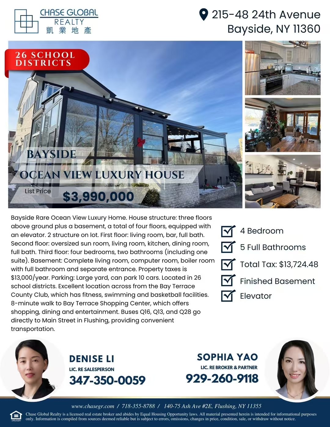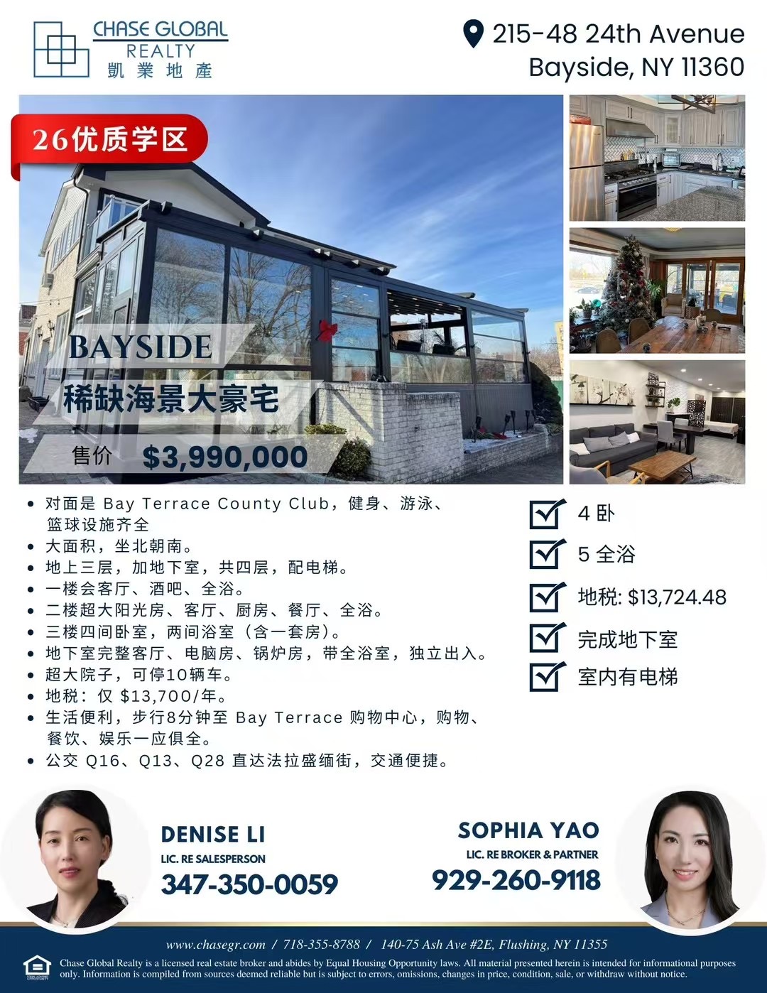 贝赛新房上市 Bayside NY 贝赛豪宅、联排别墅、新建住宅低价放盘中,独家房源抢先看🔥 凯业地产Bayside稀缺海景大豪宅出售🔥💰售价$399万💰📍215-48 24th Avenue Bayside, NY 11360 🔹对面是 Bay Terrace County Club,健身、游泳、篮球设施齐全🔹大面积,坐北朝南。🔹地上三层,加地下室,共四层,配电梯。🔹一楼会客厅、酒吧、全浴。🔹二楼超大阳光房、客厅、厨房、餐厅、全浴。🔹三楼四间卧室,两间浴室(含一套房)。🔹地下室完整客厅、电脑房、锅炉房,带全浴室,独立出入。🔸超大院子,可停10辆车。🔹地税:仅 $13,700/年。