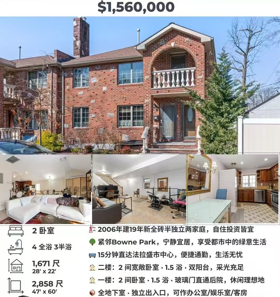 🎉新上市北法拉盛独立全砖单边两家庭,法拉盛房产全面出售 Flushing NY 房屋买卖大全,新房、二手房、低价学区房、别墅多家庭住宅一网打尽🏡 法拉盛核心地段 · 半独立砖房 · 绝佳居住体验🌳 紧邻Bowne Park,宁静宜居,享受都市中的绿意生活 🚌 15分钟直达法拉盛市中心,便捷通勤,生活无忧 📏 双层布局 · 宽敞空间 · 经典砖房设计,品质卓越 🏠 二楼:2 间宽敞卧室 · 1.5 浴 · 双阳台,采光充足 🏠 一楼:2 间卧室 · 1.5 浴 · 玻璃门直通后院,休闲理想地 📦 全地下室 · 独立出入口,可作办公室/娱乐室/客房 🚗 独立1车位车库,停车 & 储物便利售156万☎️Kevin王9172889867