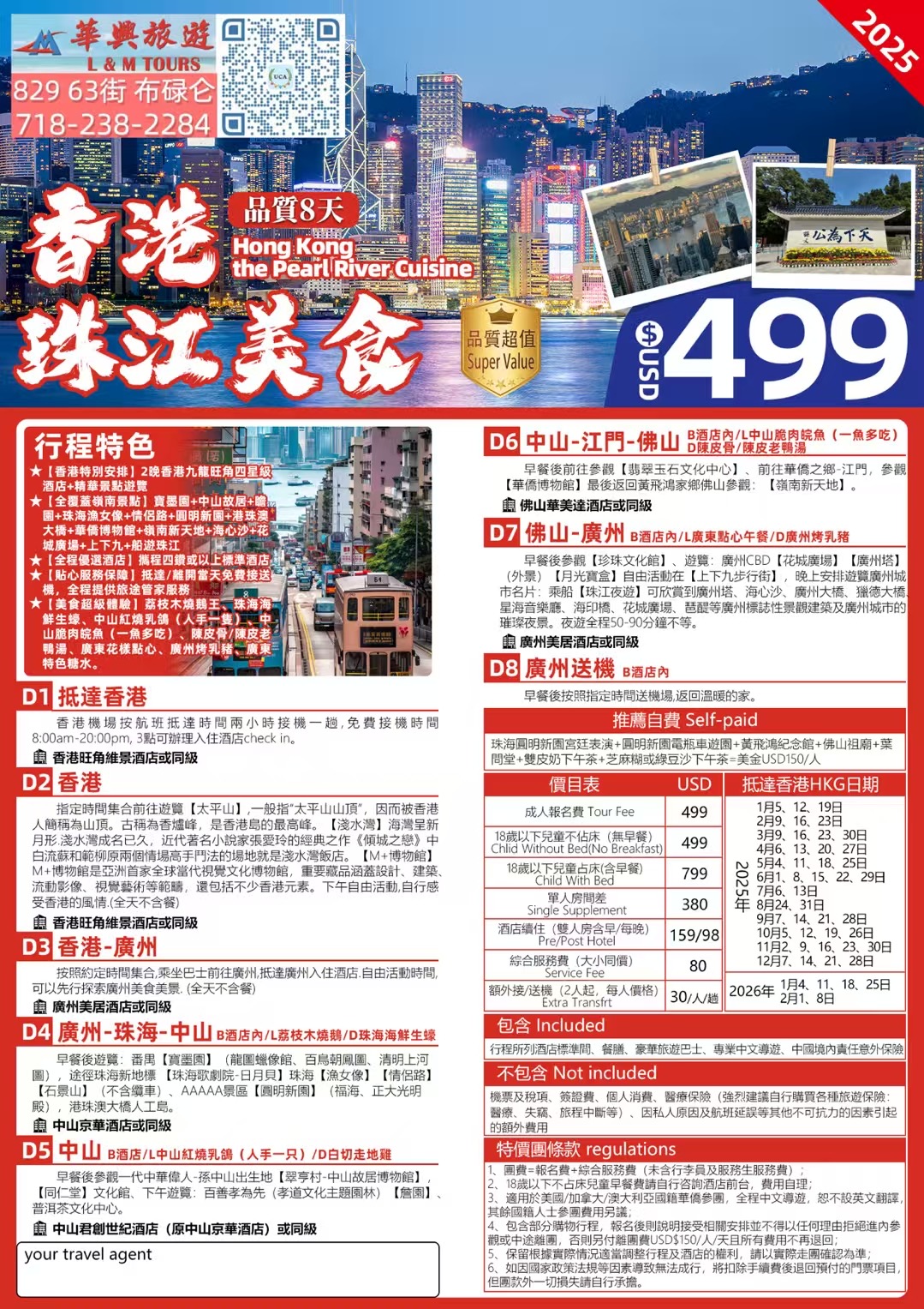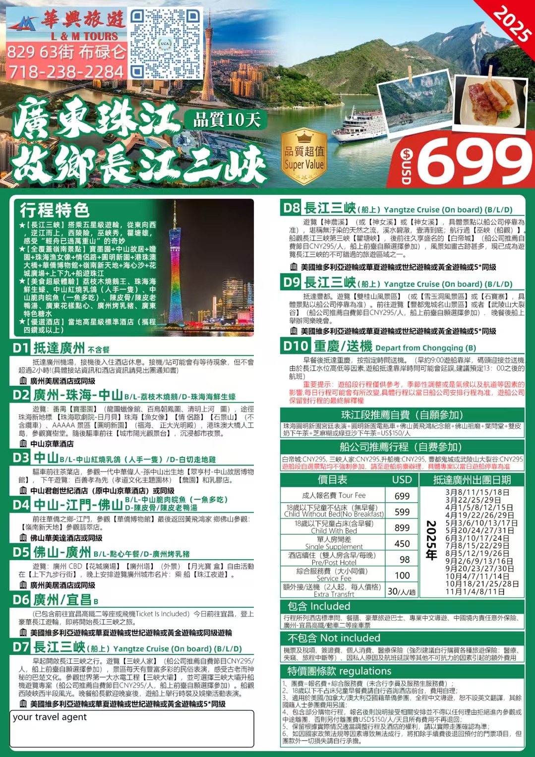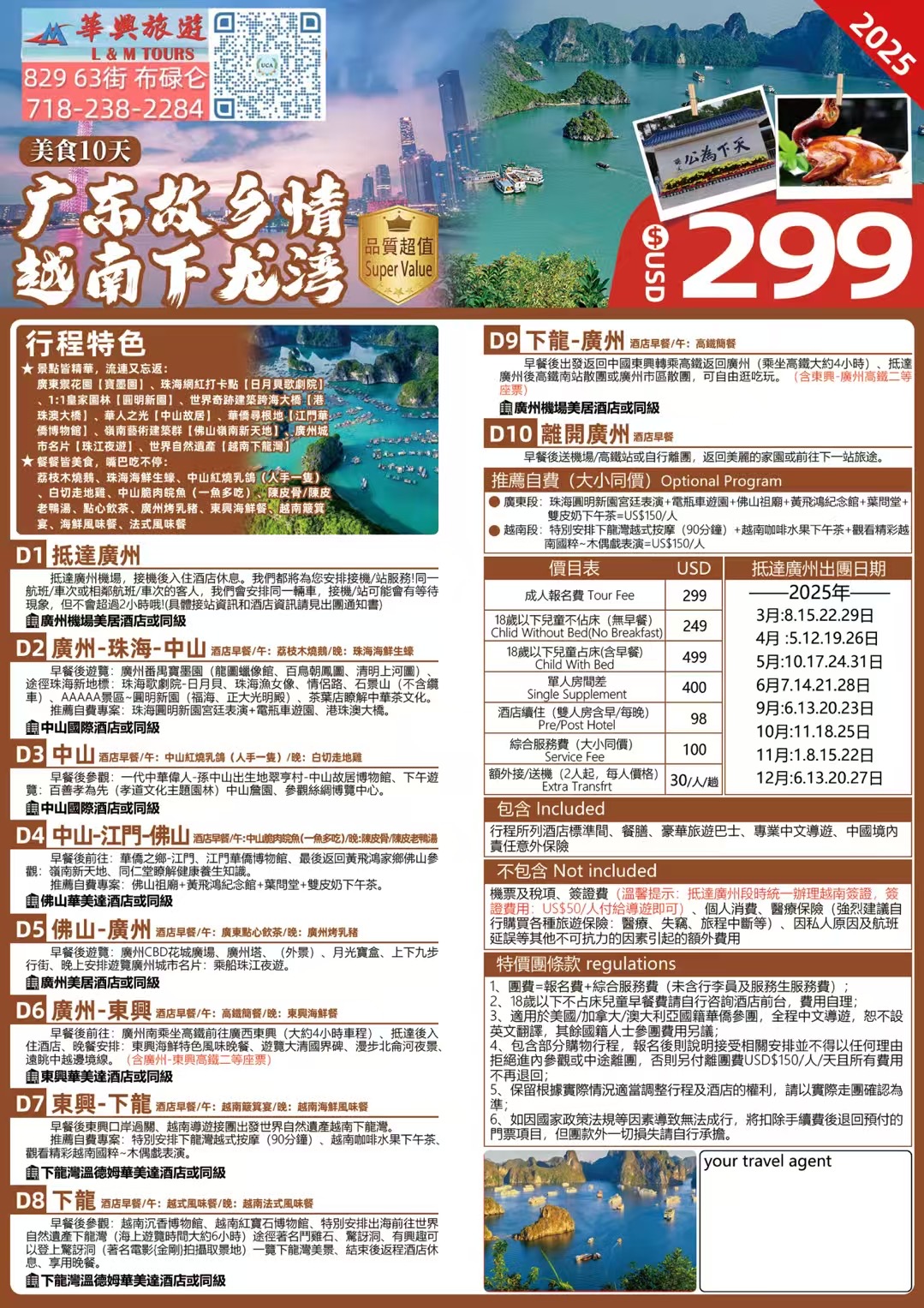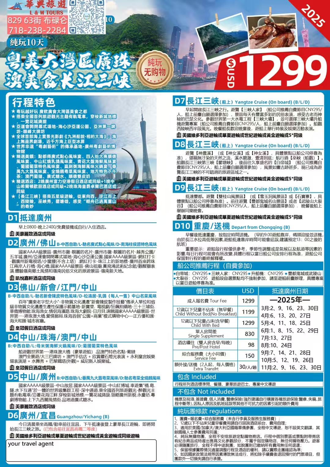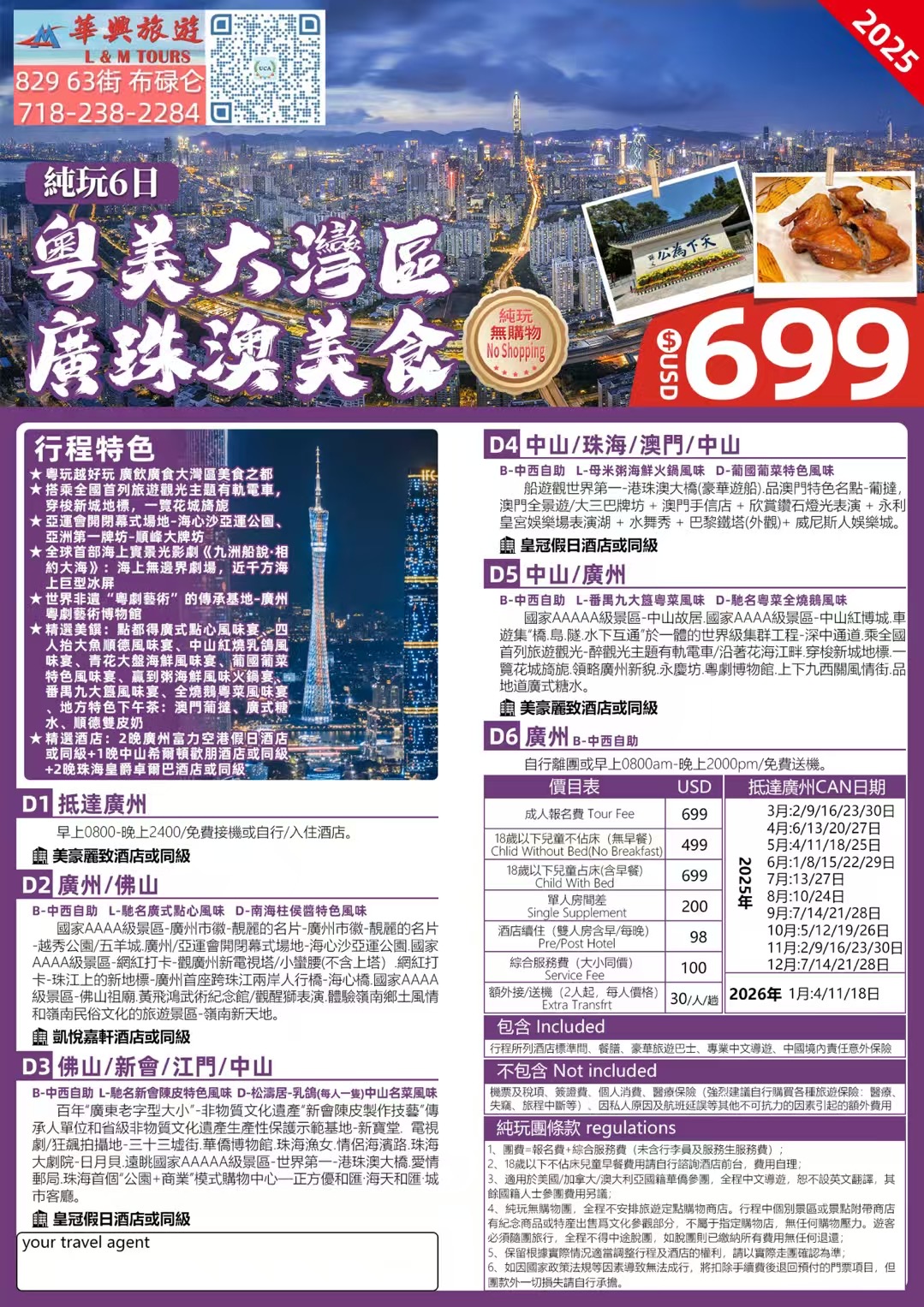 5⃣香港廣東珠江美食8天6⃣廣東珠江美食長江三峽10天7⃣廣東故鄉情越南下龍灣美食10天8⃣純玩粵美大灣區廣珠澳美食6天9⃣純玩粵美大灣區廣珠澳美食長江三峽10天