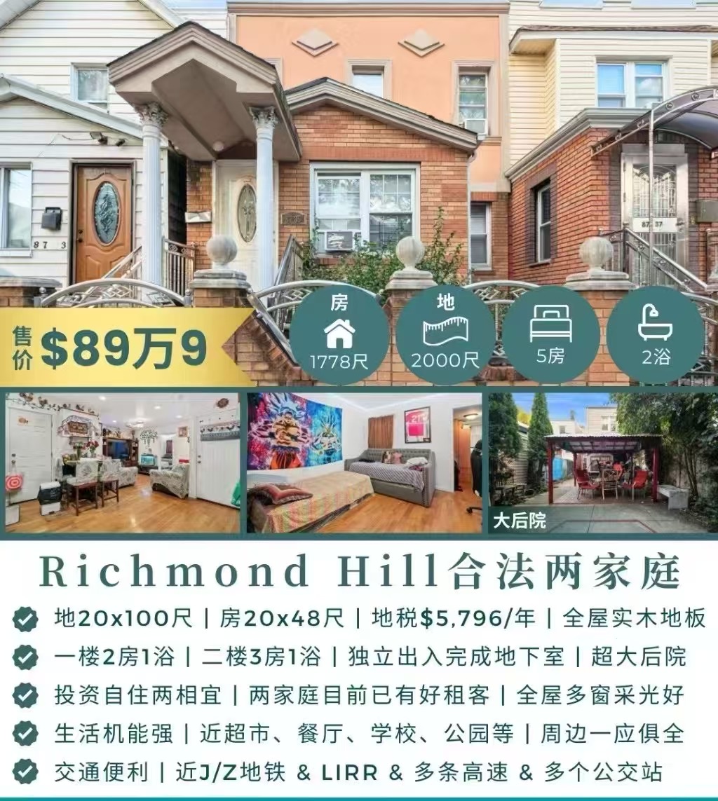 Richmond Hill房子出售 Queens NY 全新上市房产 适合首次购房移民家庭定居⏰本周末🉑看!需预约!📢 适合收租王!!! 皇后区Richmond Hill合法两家庭🏡 地20x100尺 | 房20x48尺 | 地税$5,796/年✨ 一楼2房1浴 | 二楼3房1浴 | 独立出入完成地下室 | 超大后院✨ 全屋实木地板 | 宽敞室内布局 | 全屋多窗采光好🔥 投资自住两相宜 | 两家庭目前已有好租客🛍 生活机能强 | 近超市、餐厅、学校、公园等🚆 交通便利 |近J/Z地铁 & LIRR & 多条高速 & 多个公交站💰 叫价$89万9预约☎️9175399971