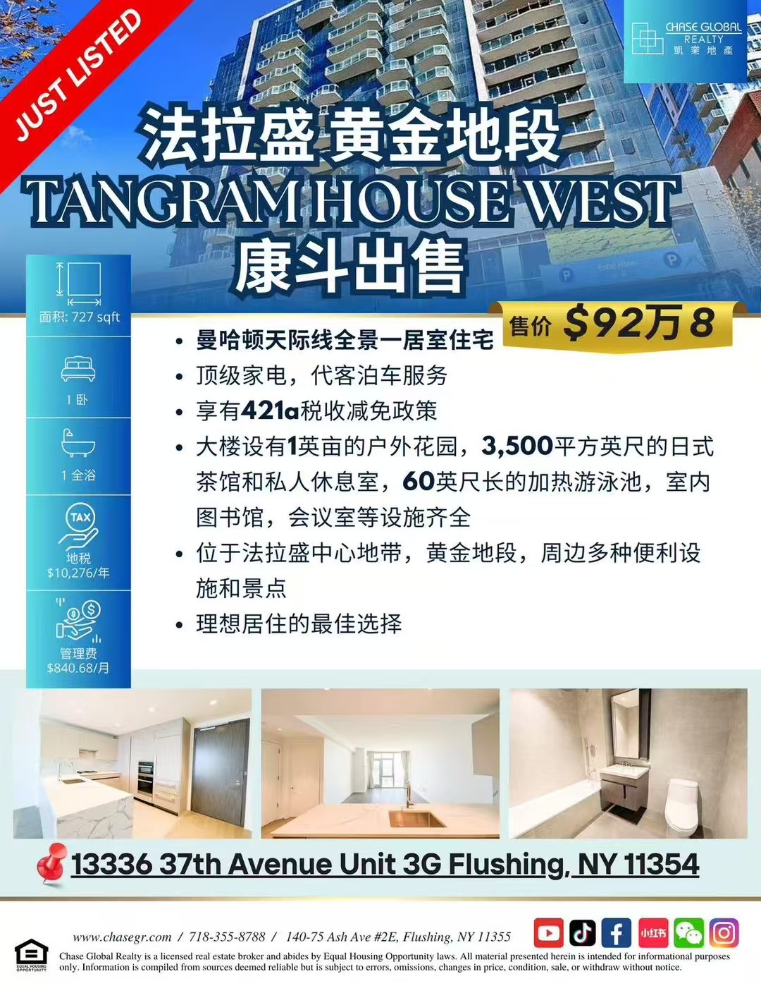 Flushing法拉盛最新康斗出售信息法拉盛全新住宅楼盘康斗 纽约华人区优质房源 投资首选 学区好 地段佳✨ 重磅推出 | TANGRAM HOUSE WEST 一居室康斗法拉盛黄金地段 🏙️ 曼哈顿天际线全景视野 🌆💰 售价:$928,000✨ 顶级家电配备,享受奢华生活🚗 提供代客泊车服务,生活更便捷🏡 享421a税收减免政策🌿 大楼设施豪华🌸 1英亩户外花园,感受自然气息🍵 3,500平方英尺的日式茶馆与私人休息室🏊♀️ 60英尺长加热泳池,四季皆宜📚 室内图书馆 & 会议室📍 位置优越,生活便利法拉盛中心地带,购物、餐饮、交通一应俱全,是您理想的居住选择!🏠 面积:727 sqft🛏️ 卧室:1🚿 浴室:1💸 地税:$10,276/年💼 管理费:$840.68/月📍 地址:13336 37TH AVENUE UNIT 3G, FLUSHING, NY 11354💬 更多详情请联系:Peggy Yam