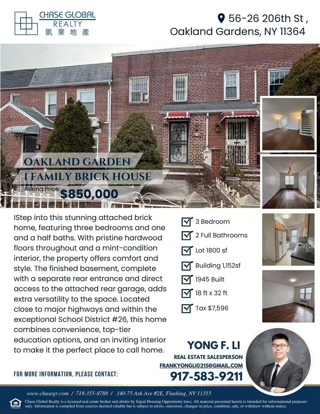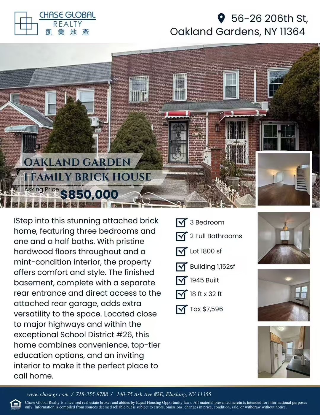 📍地址:56-26 206th St, Oakland Gardens, NY 11364💰 售价:$850,000