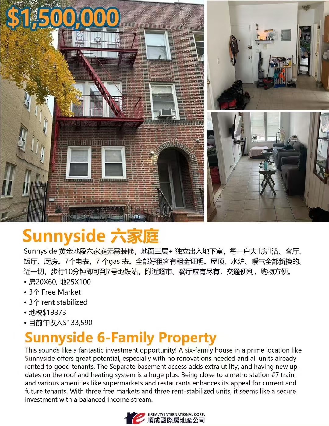 ❤️最新代理,Sunnyside 黄金地段六家庭无需装修,地面三层+ 独立出入地下室,每一户大1房1浴、客厅、饭厅、厨房。7个电表,7 个gas 表。全部好租客有租金证明。屋顶、水炉、暖气全部新换的。❤️近一切,步行10分钟即可到7号地铁站🚇附近超市、餐厅应有尽有,交通便利,购物方便。❤️房20X60, 地25X100❤️3个 Free Market❤️3个 rent stabilized地税$19373