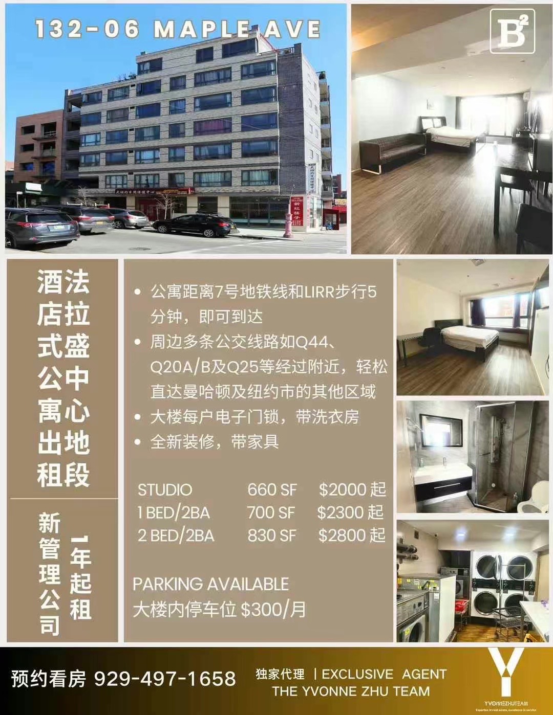 ✅全新装修,带家具✅全新管理公司,1 年起租studio 660 sf $2000 起1 bed/2Ba 700 sf $2300 起2 bed/2ba 830 sf $2800 起大楼内停车位 $300/月☎️9294971658 Celia