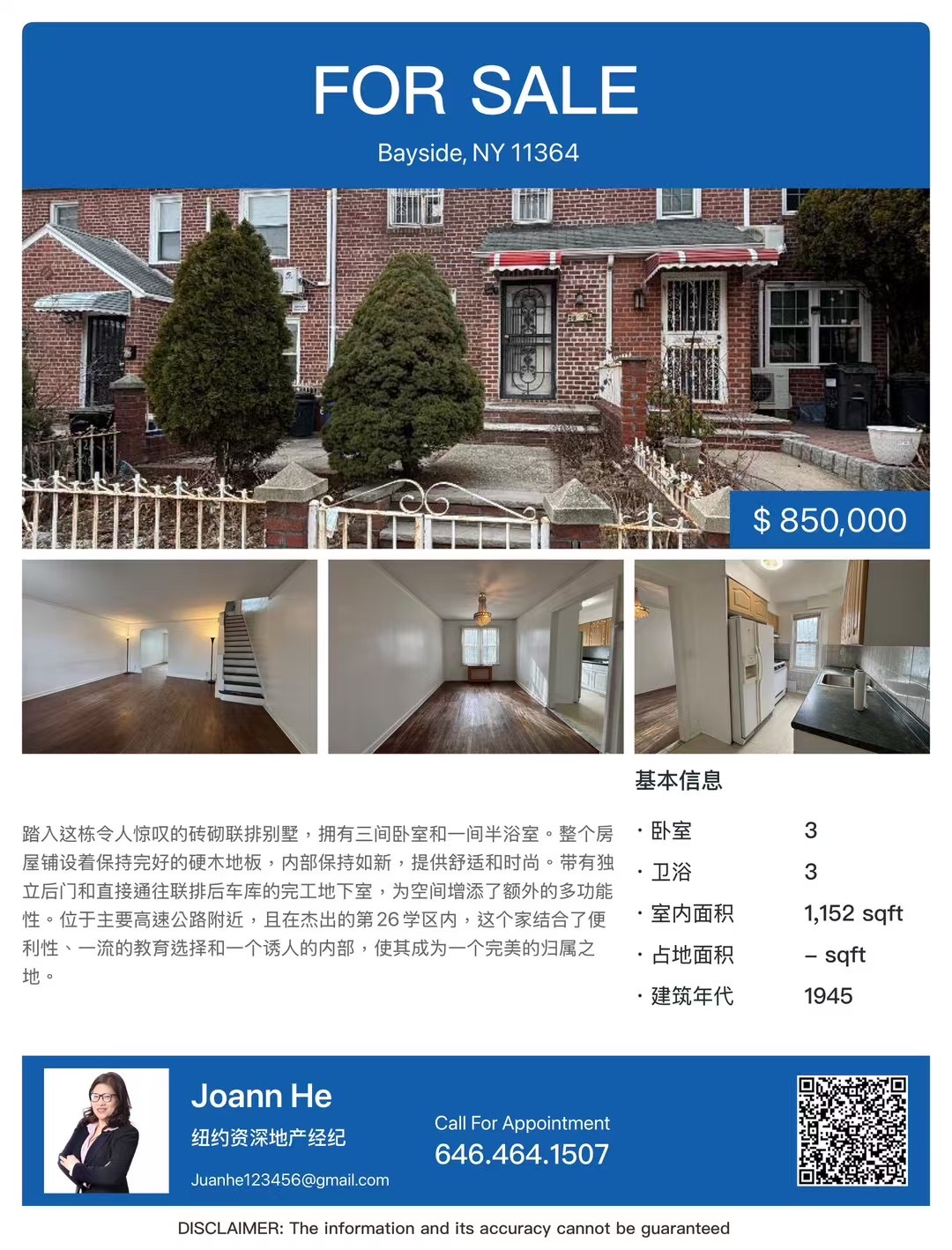 贝赛奥克兰花园房屋出售 Oakland Gardens NY 贝赛优质住宅地段,独家豪宅热销房每日更新 公司独家代理,贝𡧳Oakland Garden 26 学区一家庭才$85万,比康斗还便宜💐