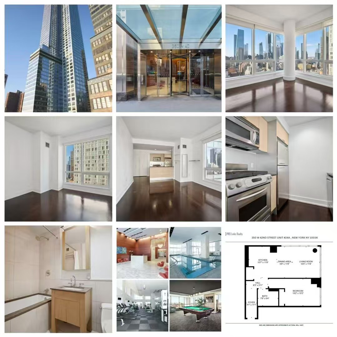 La Palestra健身中心(配有泳池、按摩浴缸和桑拿室)多个空中花园电影院/派对室 室内停车场 24A位于高楼层,大户型角户单元,双面采光(南向与西向)落地窗,提供壮观的城市、哈德逊河及远景视野,宽敞明亮,9英尺层高🏡24楼 : 1房1浴🏠 350 W 42nd Street #24A New York NY 10036👏欢迎合作转发