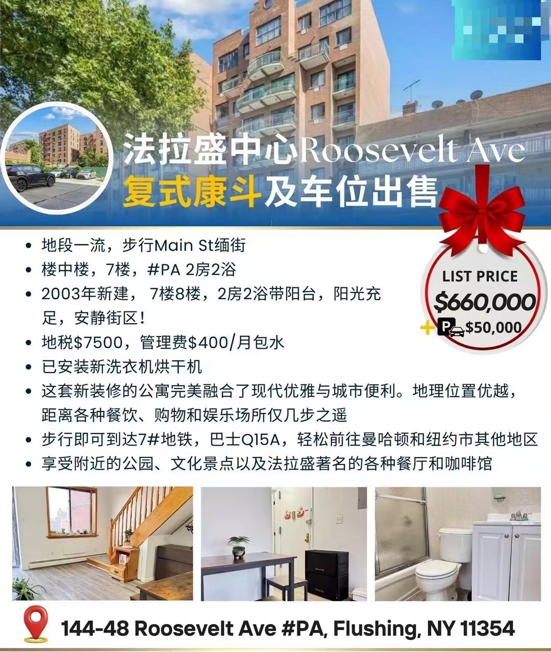 📍 144-48 Roosevelt Ave,Flushing, NY 11354单元#PA 复式楼7楼8楼,2房2浴 $66万使用面积一尺才$780 车位#P2 $5万