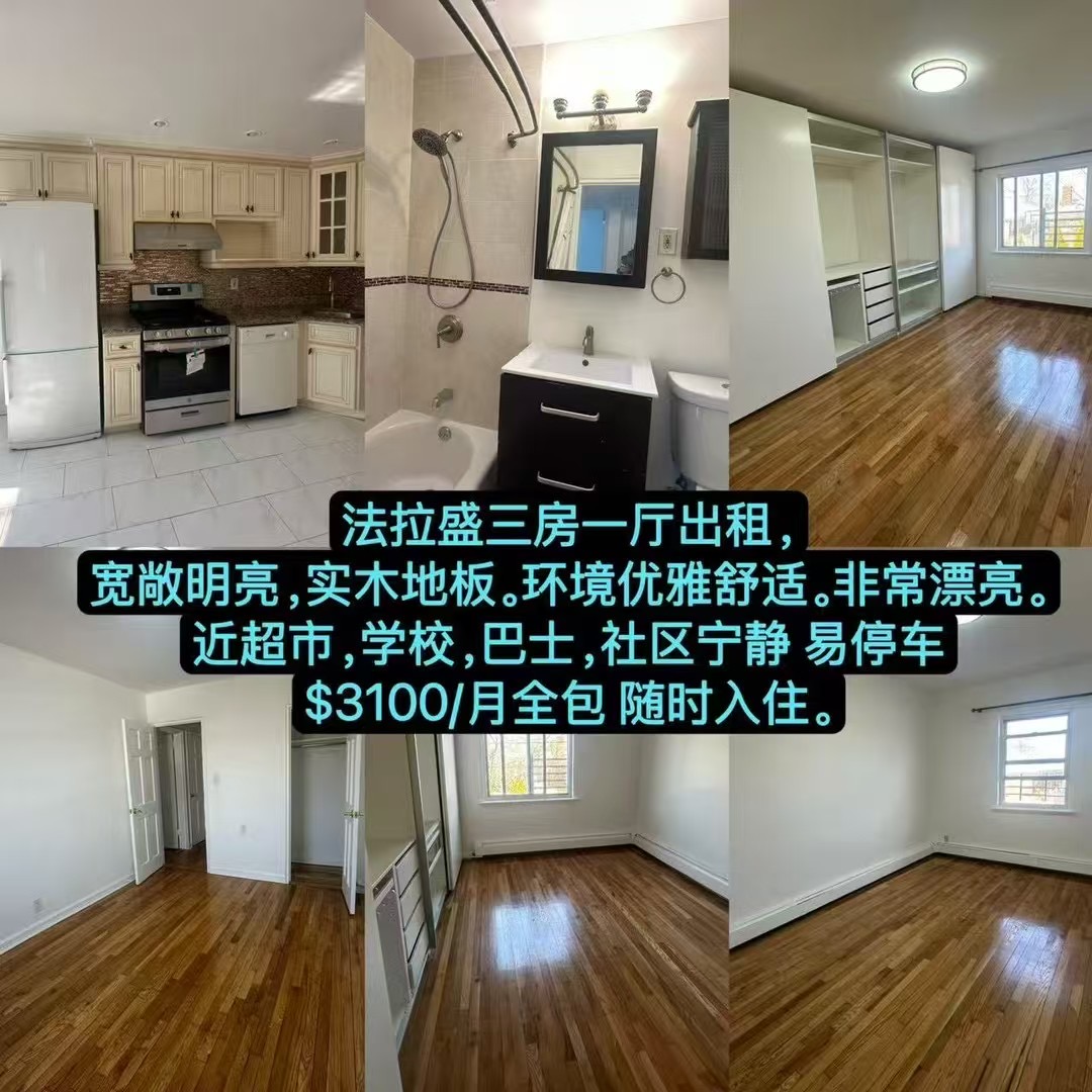 法拉盛带窗三房一厅出租 靠近商圈 超市餐饮齐全Flushing三房一厅整套出租 新装修 宽敞明亮 家电齐全【法拉盛三房一厅出租】✨宽敞明亮,$3100全包!📍 地理位置优越|近超市、学校、巴士站,社区安静,停车方便🏠 三房一厅|空间宽敞,实木地板,环境优雅舒适🚿 高端配套|带洗烘机、洗碗机,居住便利💰 租金:$3100/月 全包|水、电、暖气、Gas全部包含🕒 随时入住,拎包即住!📩 详情咨询&预约看房请私信!9342332555