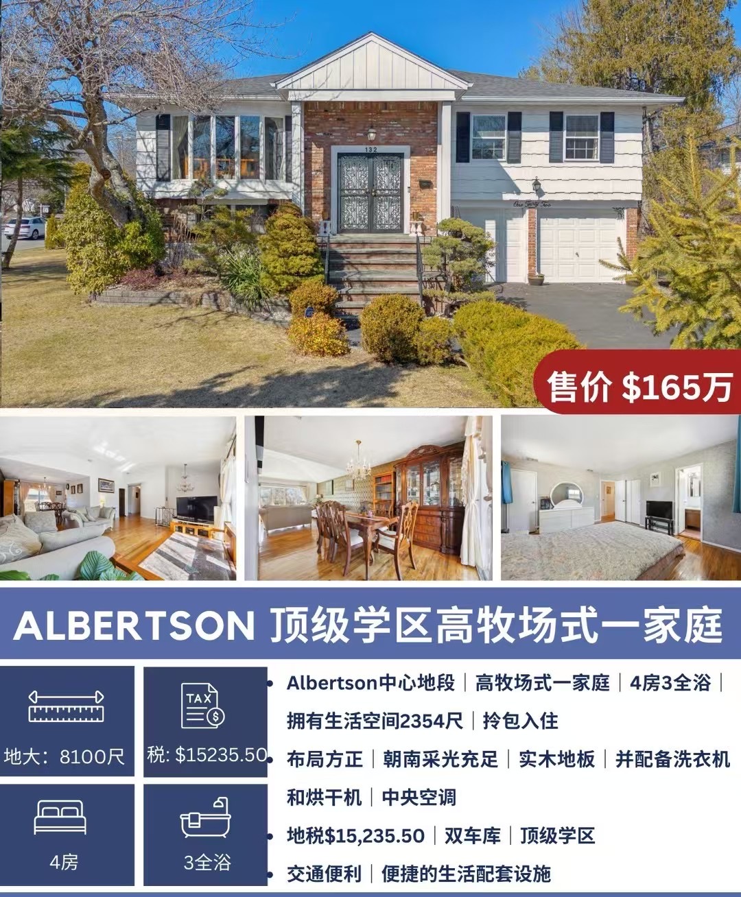 Albertson艾伯森独家房源 精装修住宅带车位安静街区long island长岛房子出售🌈春暖花开 新房上市供不应求🌸͏ [玫瑰]欢迎转发[得意]合作周日公展1-3 欢迎光临吖🎈Albertson中心地段 长岛36出口高牧场式一家庭 4房3全浴❤💙💛超大室内面积 2354尺 拎包入住💎学分9/9/10👍布局方正|朝南采光充足|实木地板|中央空调|双车库 地税$15,235.50 要价165万💰917 293 8698