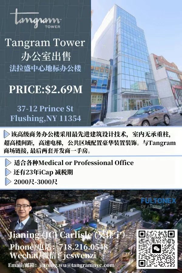 法拉盛写字楼办公室出售 精装修商务空间 适合律师楼会计楼医疗用途Tangram 开发商最后两套一手办公室出售!欢迎合作。