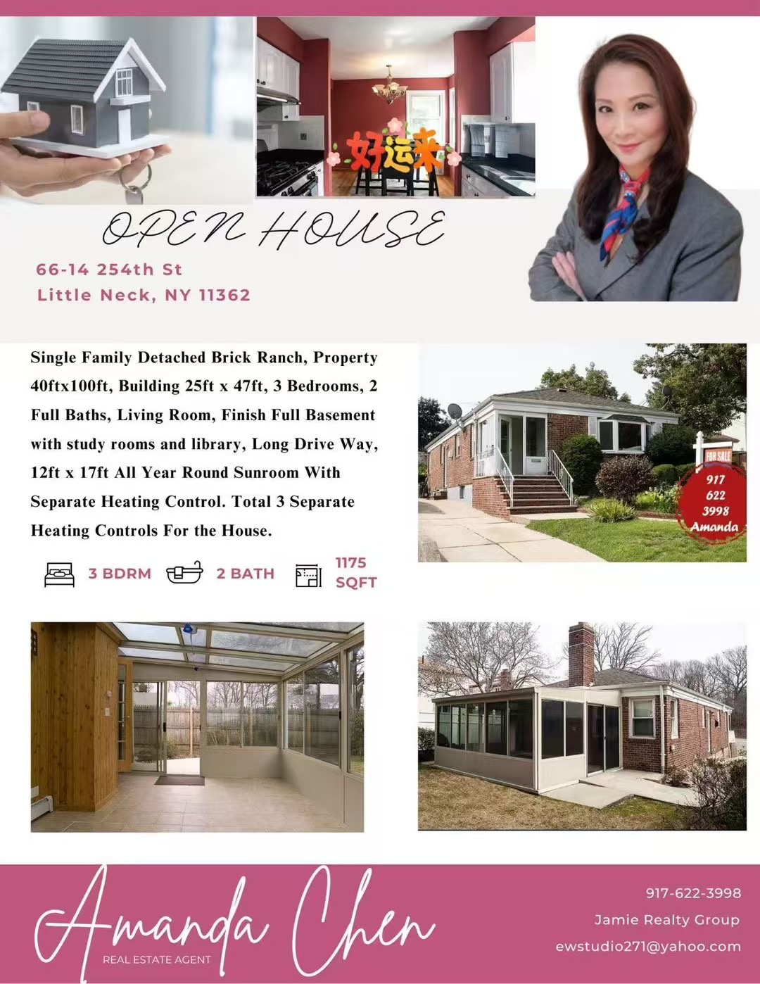 小颈独立一家庭出售 华人区安静街道 学区好 自住首选Little Neck独栋一家庭出售 富人区环境优美 靠近超市学校🌹最新上市🌹66-14 254 St Little neck👉拎包入住.好房不等人[勾引]欢迎预约👏好區小頸獨立一家庭砖砌牧场式房子40x100,建筑25x 47 。一楼3间卧室,全套浴室,大客厅.饭厅。地下室有2房1浴+客廳獨立岀口. 還有獨立车道可以停3部車。12x 17阳光房,带独立供暖控制。靠近所有公交车,LIE 495,SD 26、MS67、PS 221、卡多佐HS。距离购物中心、超市、餐厅、高尔夫球场、医疗中心、皇后区社区学院和皇后县农场博物馆仅几分钟路程。地稅:$9905/年售:$113.8萬。歡迎合作轉發請電:917-622-3998