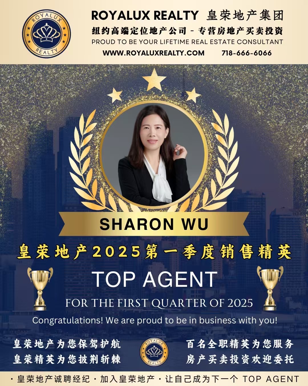 New York 华人 Real Estate Agent 专业团队助力买房卖房投资出租全覆盖🏆 很荣幸再次上榜【皇荣地产2025年第一季度销售精英荣誉榜】!衷心感谢各位客户的信任与支持!2025年仅用三个月时间,我们皇荣地产团队已创下1.63亿美元成交额,超越去年半年业绩!仅今年第一季度已成功助力158组家庭实现纽约安家的梦想。