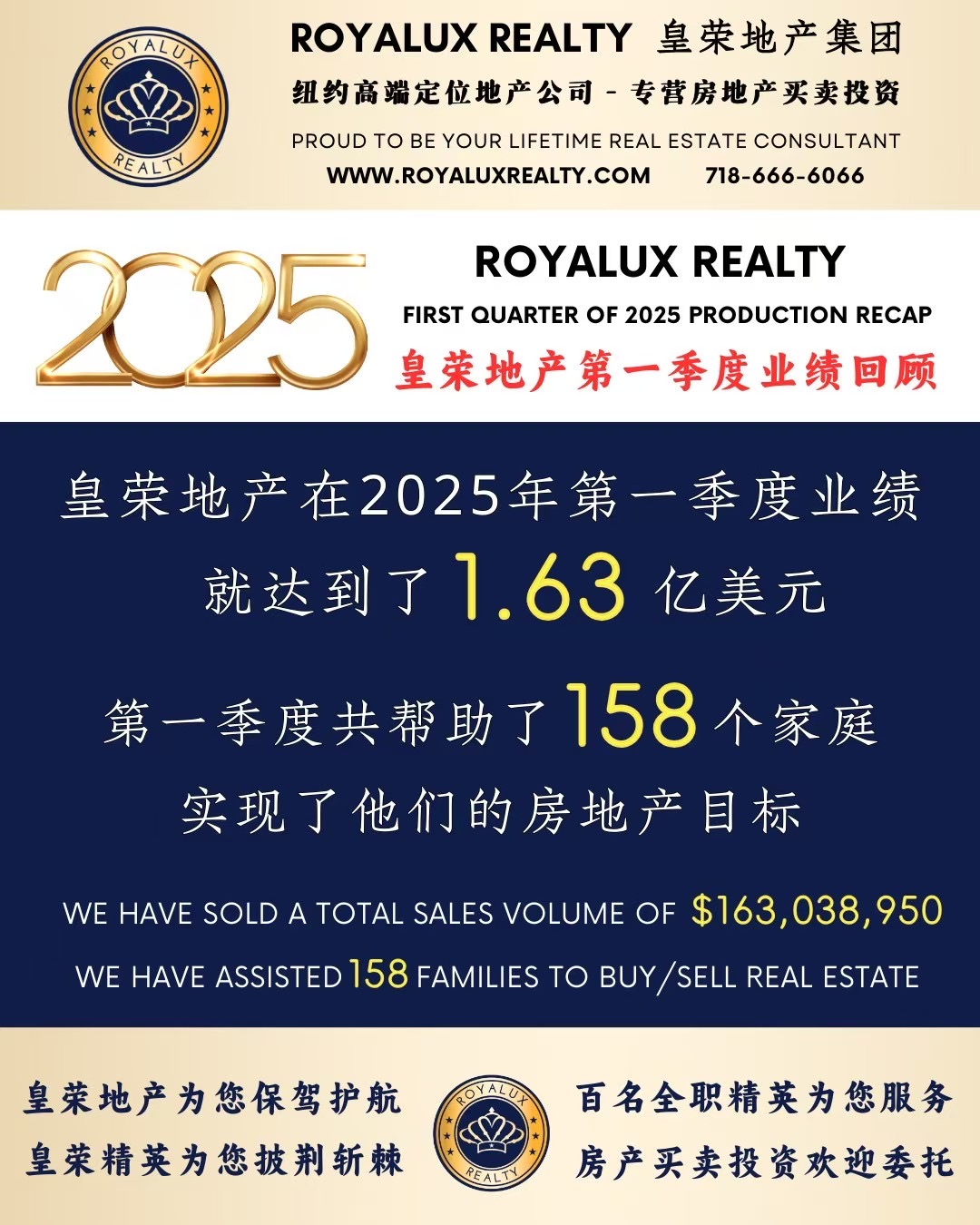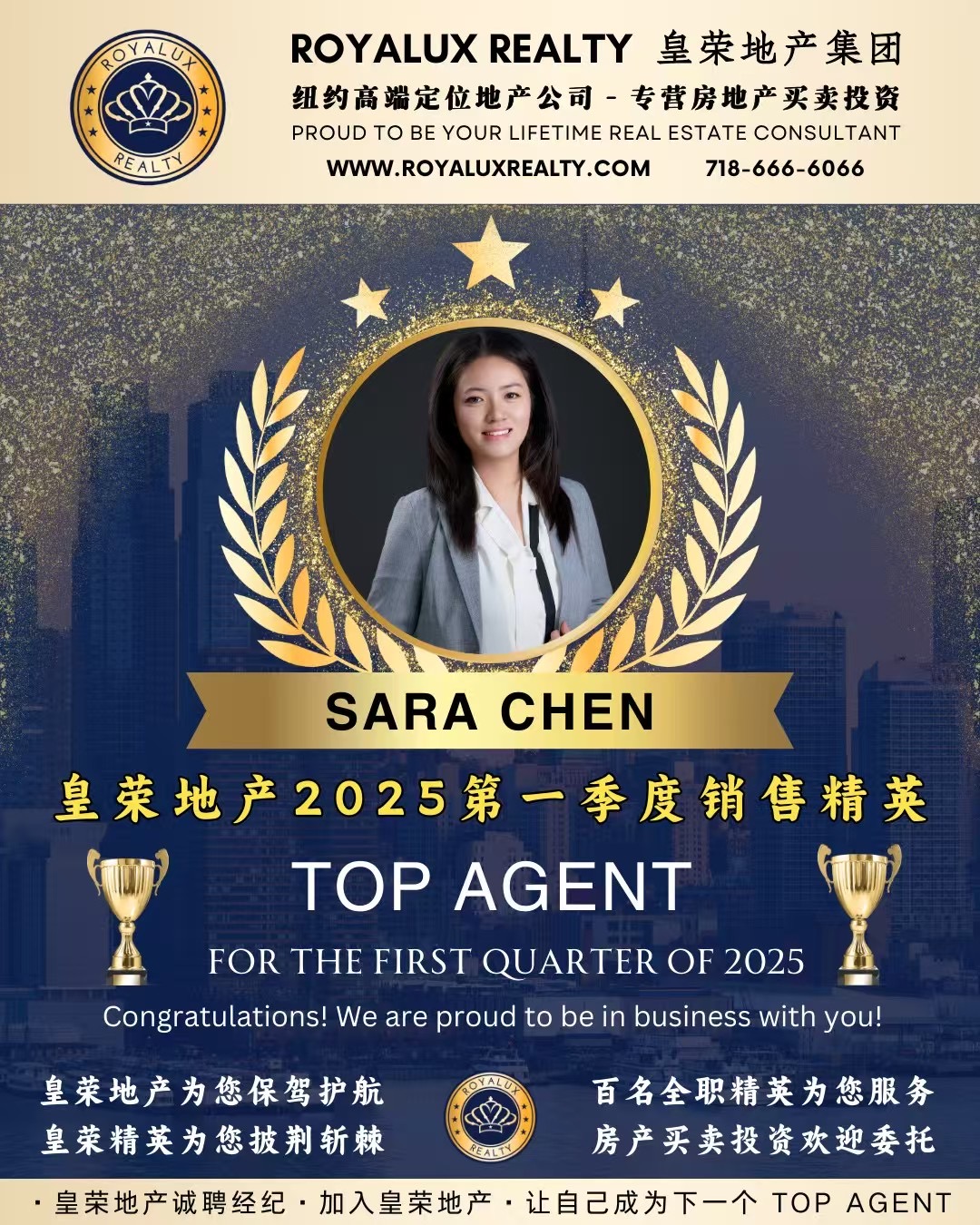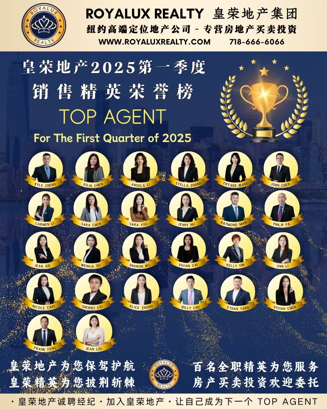 曼哈顿房地产经纪公司推荐 中文服务 专业代理高端住宅与投资项目🏆 很荣幸再次上榜【皇荣地产2025年第一季度销售精英荣誉榜】!衷心感谢各位客户的信任与支持!2025年仅用三个月时间,我们皇荣地产团队已创下1.63亿美元成交额,超越去年半年业绩!仅今年第一季度已成功助力158组家庭实现纽约安家的梦想。