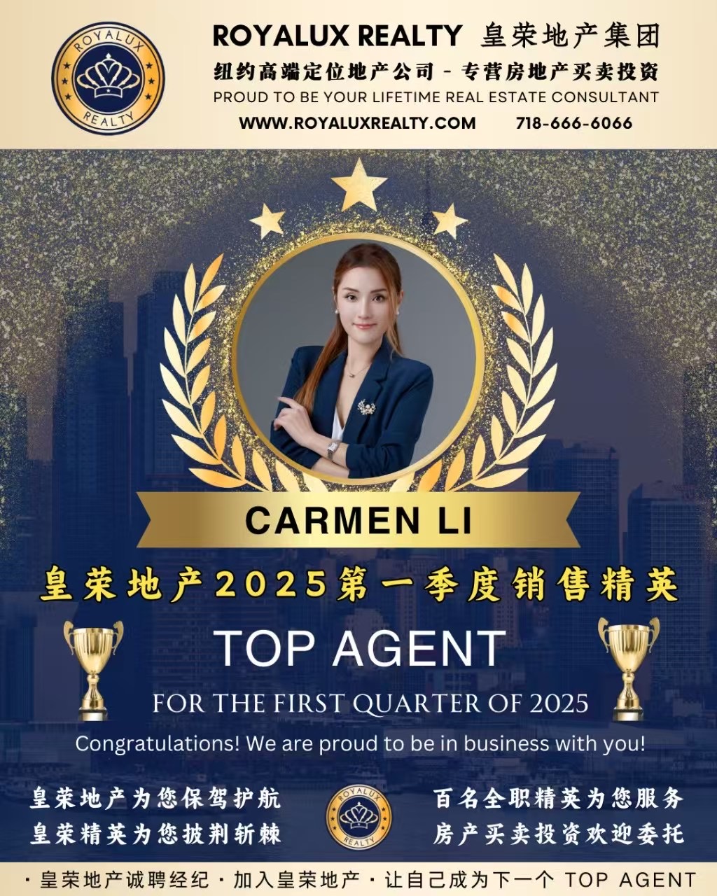 华人房地产投资顾问纽约首选 精通商业地产与住宅房产买卖流程🏆 很荣幸再次上榜【皇荣地产2025年第一季度销售精英荣誉榜】!衷心感谢各位客户的信任与支持!2025年仅用三个月时间,我们皇荣地产团队已创下1.63亿美元成交额,超越去年半年业绩!仅今年第一季度已成功助力158组家庭实现纽约安家置业的梦想。