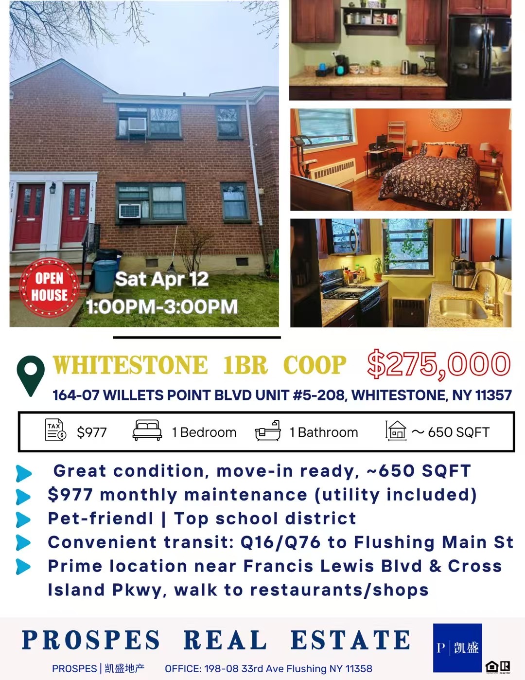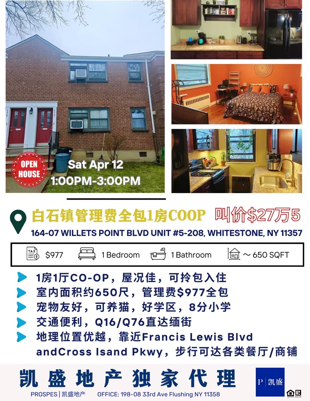 📍地址:164-07 Willets Point Blvd #5-208, Whitestone, NY 11357拎包入住|屋况佳|宠物友好📐室内约650尺,管理费$977/月,全包水电暖煤气🐱可养猫,好学区(8分小学)