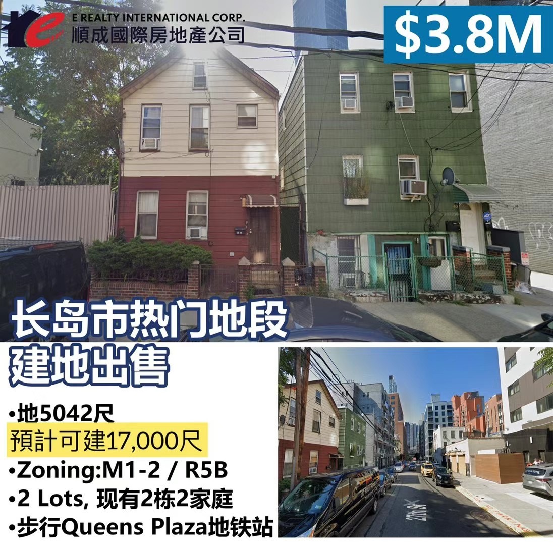 🌟长岛市热门地段, 建地出售长岛房子出售 long island🌟地址: 40-** 27 St🔥地大: 5,042尺🔥售价$3.8M🌟預計可建17,000尺🌟Zoning:M1-2/R5B🌟2 Lots,现有2栋2家庭🌟步行Queens Plaza地铁站🔥顺成国际房地产 E Realty International Corp☎️646-460-0972 徐 Emily