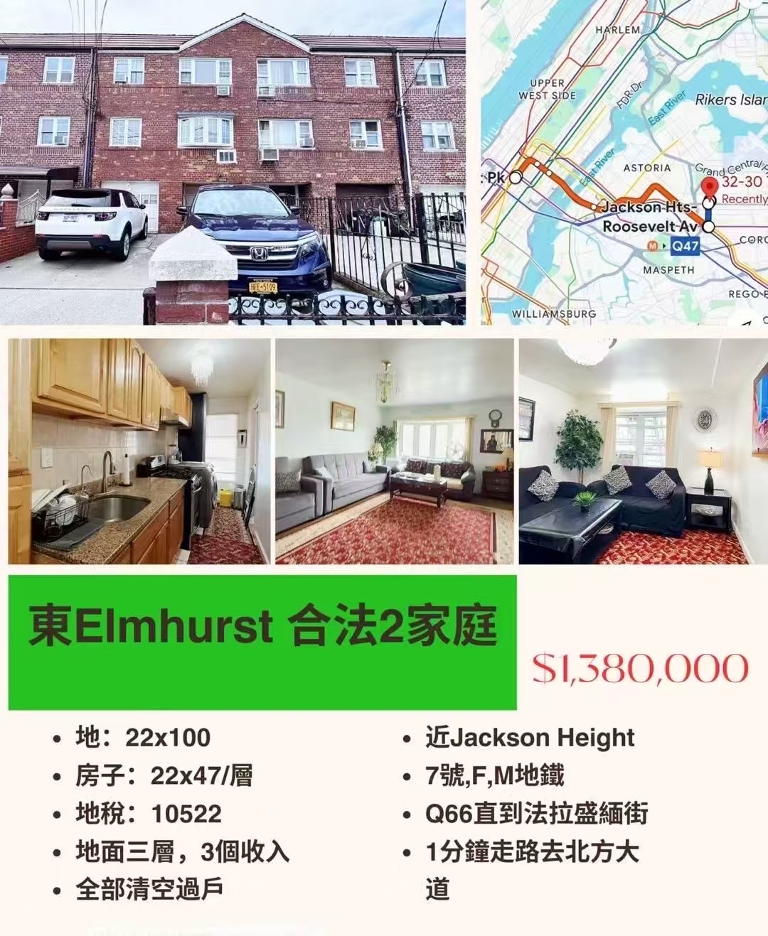 东Elmhurst/Jackson Height合法2家地面 共三层,全部清空过户!💰售:$138万💎 1分钟走路去北方大道💎 7号,F,M地铁 直达中城💎 Q66 直接到法拉盛缅街!地:22x100房子:22x47/层