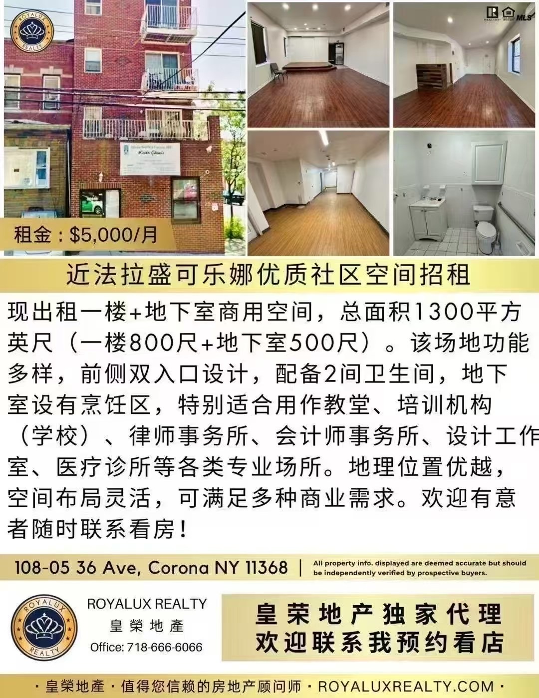 🏆近法拉盛可乐娜优质社区空间招租 | 租金$5000/月🏆现出租一楼+地下室商用空间,总面积1300平方英尺(一楼800尺+地下室500尺)。该场地功能多样,前侧双入口设计,配备2间卫生间,地下室设有烹饪区,特别适合用作教堂、培训机构(学校)、律师事务所、会计师事务所、设计工作室、医疗诊所等各类专业场所。地理位置优越,空间布局灵活,可满足多种商业需求。欢迎有意者随时联系看房!📲约看请联系负责经纪:Laura 917-257-6112