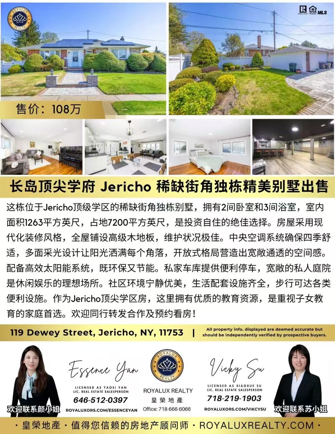 🔥皇荣地产独家代理长岛好房!!🏆长岛顶尖学府 Jericho 稀缺街角独栋精美别墅出售| 售价108万