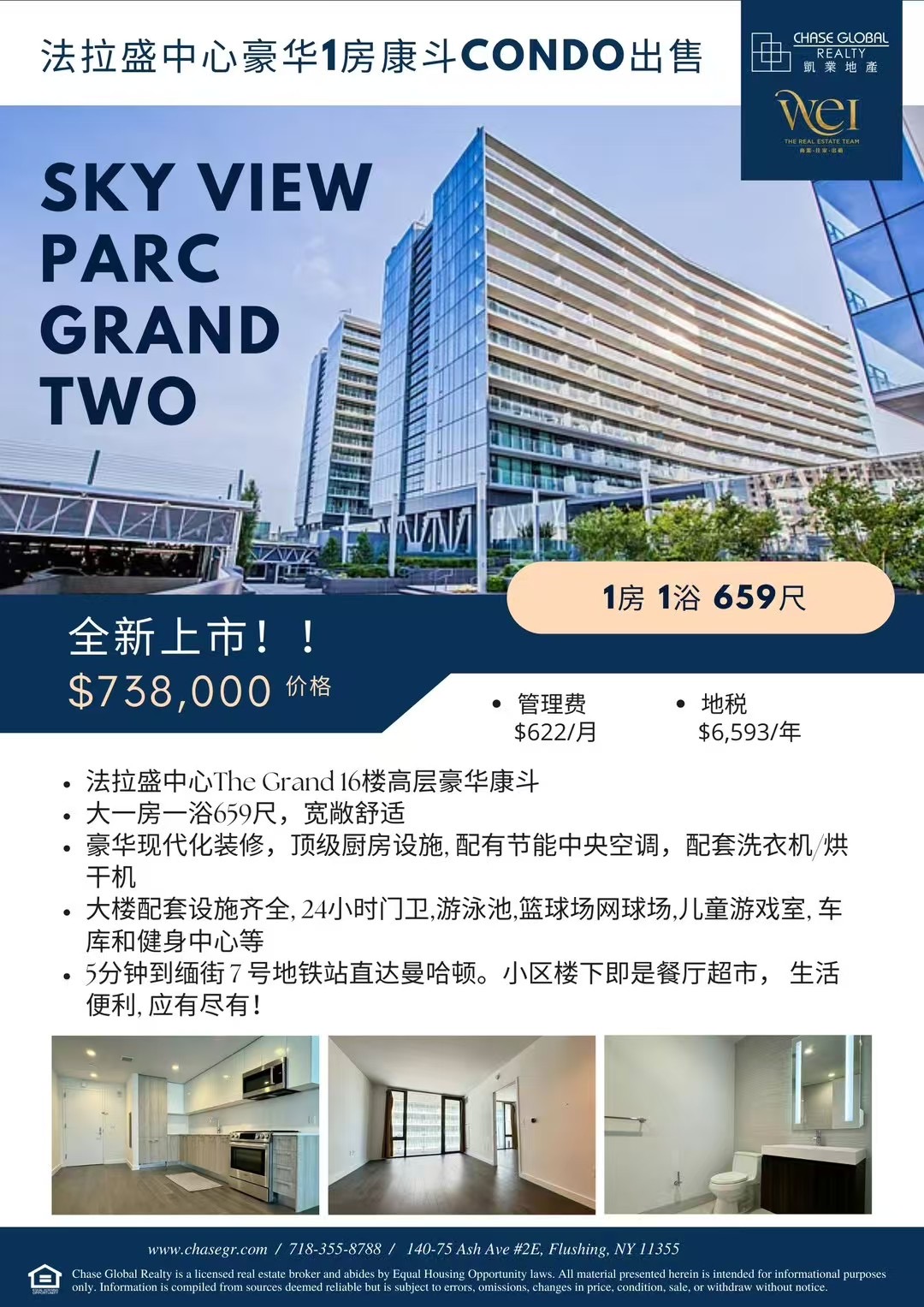 🍾凯业地产新房源上市!法拉盛中心豪华高层康斗出售🍾📍The Grand Two | 131-03 40th Rd#16D, Flushing, NY 11354🏢法拉盛中心The Grand 豪华16楼高层康斗🧧大一房一浴,宽敞舒适