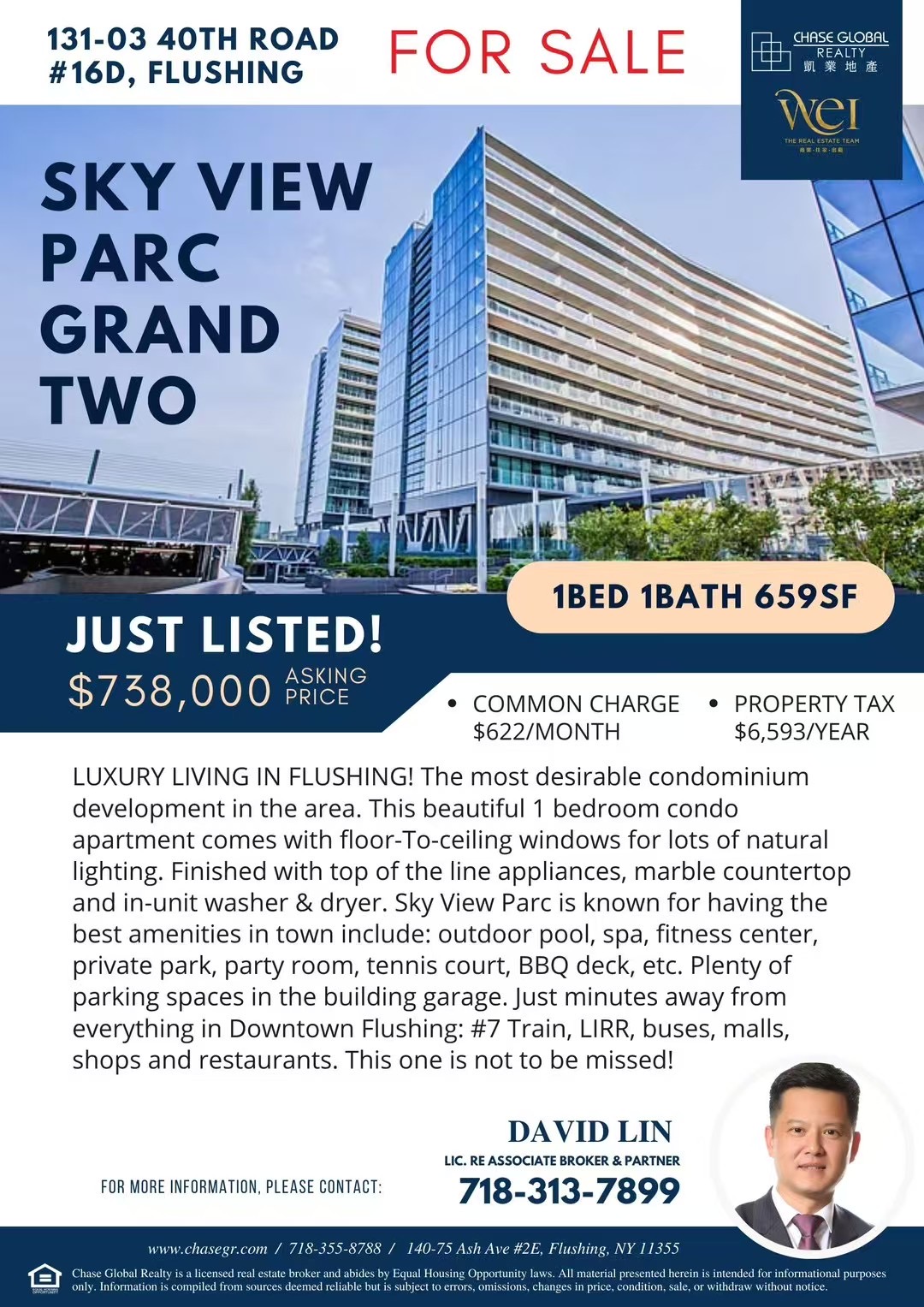 💎豪华现代化装修,顶级厨房设施, 配有节能中央空调,配套洗衣机/烘干机 🔅大楼配套设施齐全, 24小时门卫,游泳池,篮球场网球场,儿童游戏室, 车库和健身中心等 🚉5分钟到缅街 7 号地铁站直达曼哈顿。小区楼下即是餐厅超市, 生活便利, 应有尽有!☎欢迎合作 Wei Team with Chase Global Realty - David Lin 718-313-7899