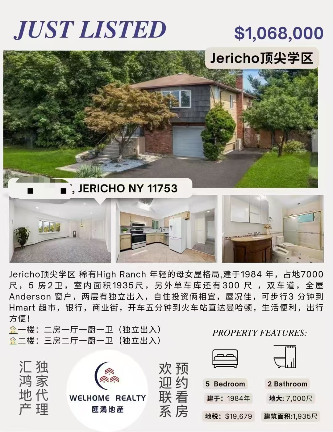 High Ranch 年轻🉐母女屋格局建于1984 年,占地7000 尺,5 房2 浴有1935尺,另外单车库还有300 尺 ,双车道,全屋Anderson 窗户,一楼二房一厅一厨一卫独立出入,二楼三房二厅一厨一卫独立门进出口,自住投资俩相宜,可步行3 分钟到Hmart 超市,银行,商业街,开车五分钟到火车站直达曼哈顿 开价106.8 万