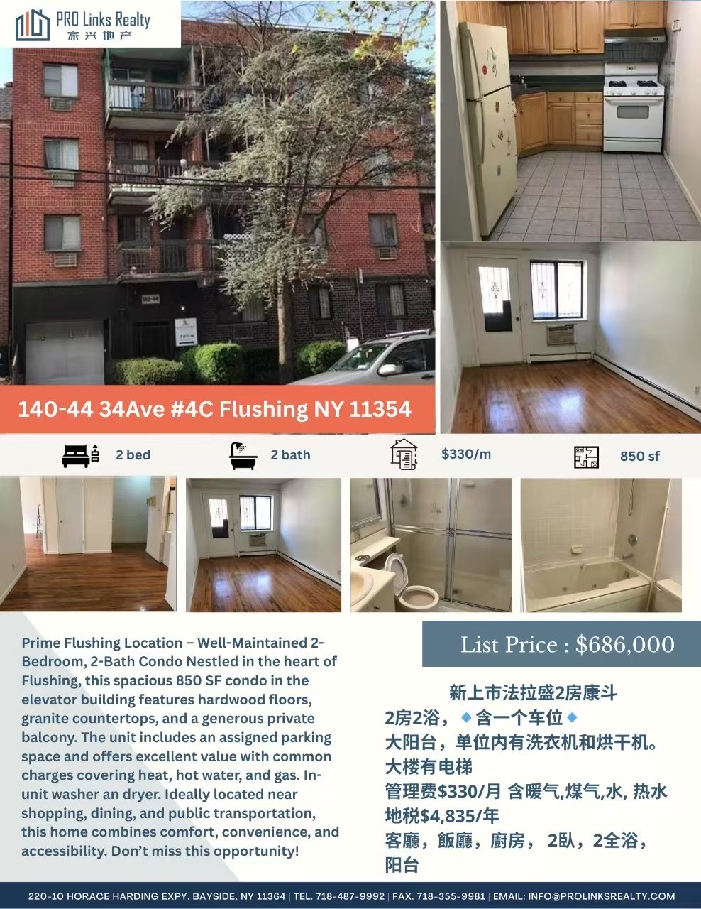 🎉新上市法拉盛2房康斗🎉2房2浴,🔹含一个车位🔹大阳台,单位内有洗衣机和烘干机。大楼有电梯管理费$330/月 含暖气,煤气,水, 热水地税$4,835/年🧧售$68万6🏠客廳,飯廳,廚房, 2臥,2全浴,大阳台🏠140-44 34th Ave unit 4CFlushing NY 11354👏欢迎合作转发☎️Lillian 刘 917-4188233☎️ Kaman 黎347-233-0888