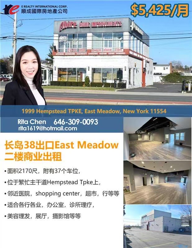 长岛38出口East Meadow二楼商业出租,面积2170尺,附有37个车位,位于繁忙主干道Hempstead Tpke上,邻近医院,shopping center,超市,银行等等,适合各行各业,办公室,诊所理疗,美容理发,展厅,摄影馆等等,更多信息请联系Rita 646-309-0093