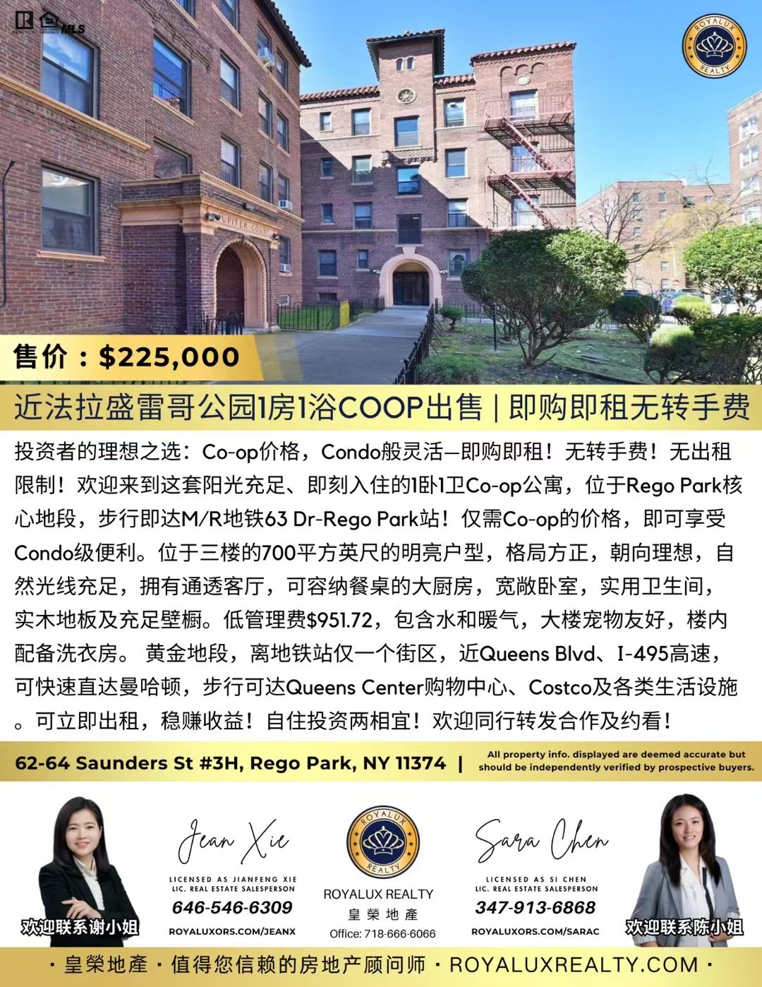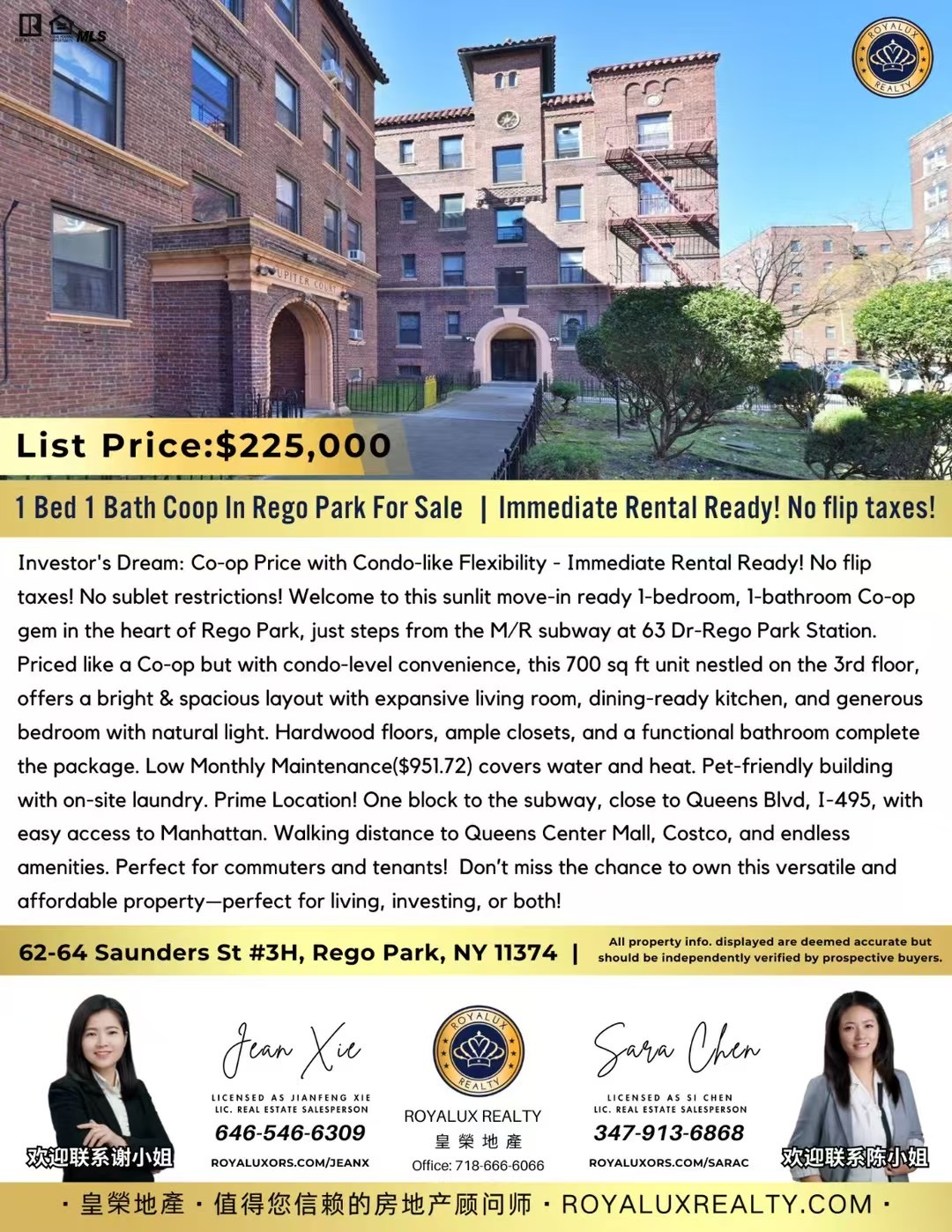 🏢 房子介绍:投资者的理想之选:Co-op价格,Condo般灵活—即购即租!无转手费!无出租限制!欢迎来到这套阳光充足、即刻入住的1卧1卫Co-op公寓,位于Rego Park核心地段,步行即达M/R地铁63 Dr-Rego Park站!仅需Co-op的价格,即可享受Condo级便利。位于三楼的700平方英尺的明亮户型,格局方正,朝向理想,自然光线充足,拥有通透客厅,可容纳餐桌的大厨房,宽敞卧室,实用卫生间,实木地板及充足壁橱。低管理费$951.72,包含水和暖气,大楼宠物友好,楼内配备洗衣房。 黄金地段,离地铁站仅一个街区,近Queens Blvd、I-495高速,可快速直达曼哈顿,步行可达Queens Center购物中心、Costco及各类生活设施 。可立即出租,稳赚收益!自住投资两相宜!欢迎同行转发合作及约看!