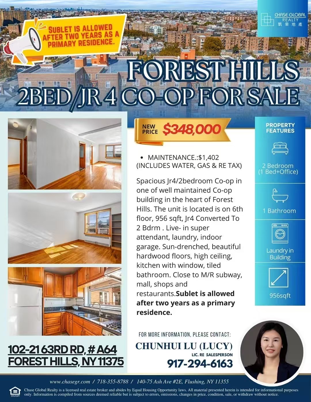森林小丘电梯公寓出售 近地铁带阳台 拎包入住森林小丘低管理费公寓出售 自住与出租皆宜2房1浴Coop,独立间厨房、大步入式衣帽间,对面9分的中学