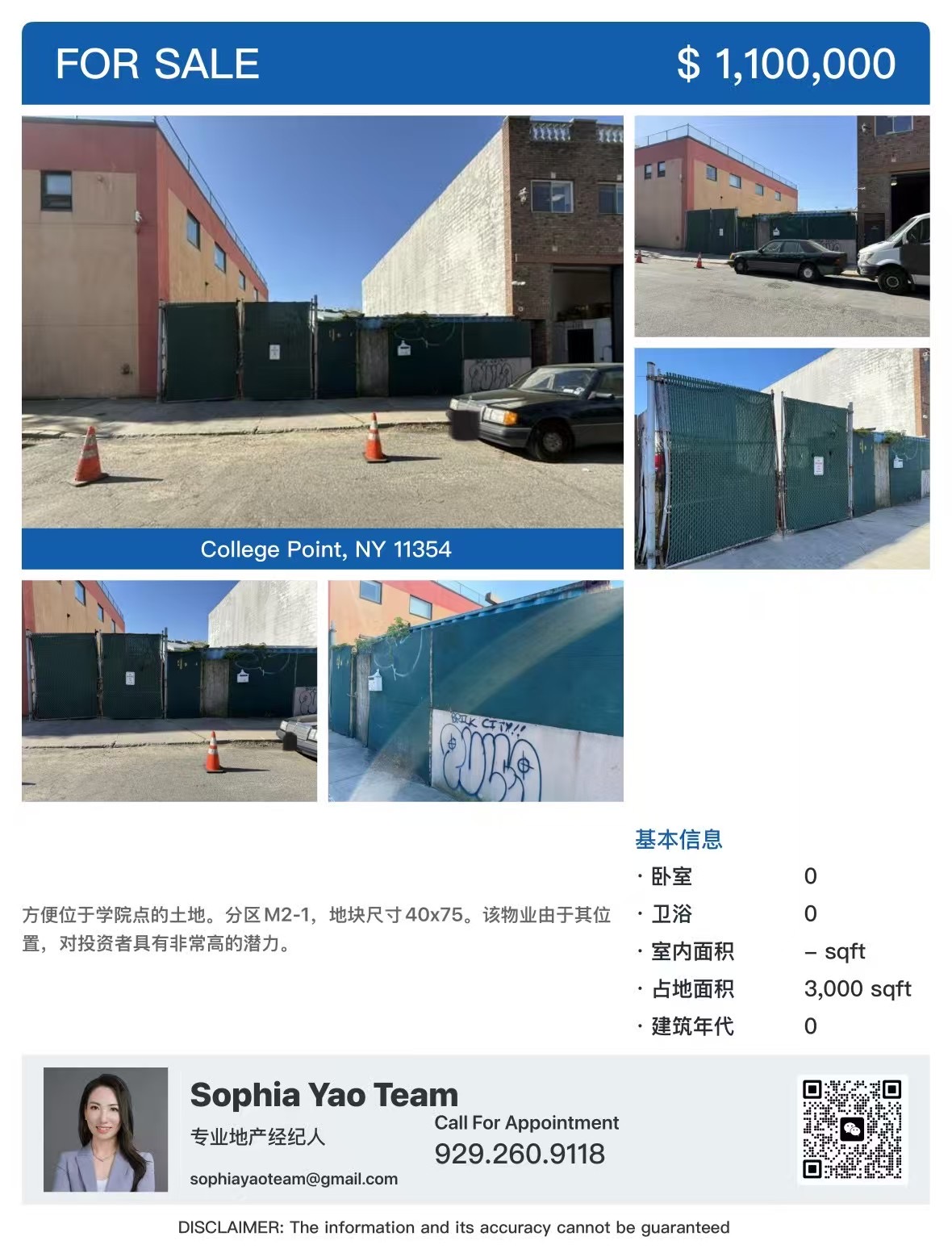 大学点仓库用地出售110万,位于大学点College Point学院点的土地。分区M2-1,地块尺寸40x75。该物业由于其位置,对投资者具有非常高的潜力!预约☎️:929-260-9118