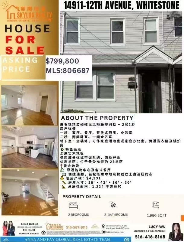 白石镇一家庭出售 近法拉盛 精装修 带车库后院 实用户型白石镇独栋一家庭出售 学区好 环境佳 华人家庭理想选择新价格 ‼️周末公展