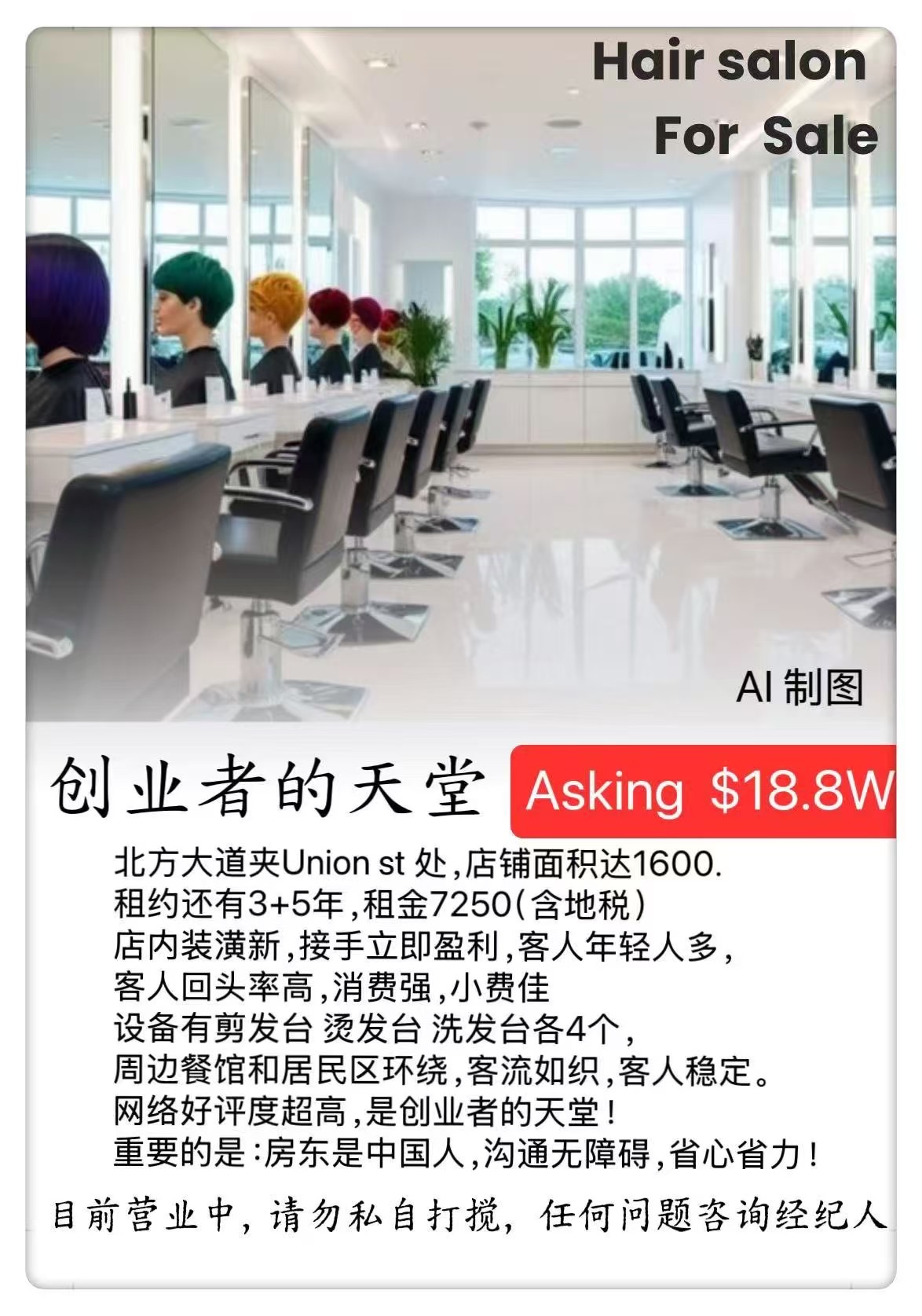 💈北方大道夹Union st 处,现代轻奢装修美发店 面积达1200Sqft ,加上300sqft 的私密阁楼 可用于美容 美睫 增加收入