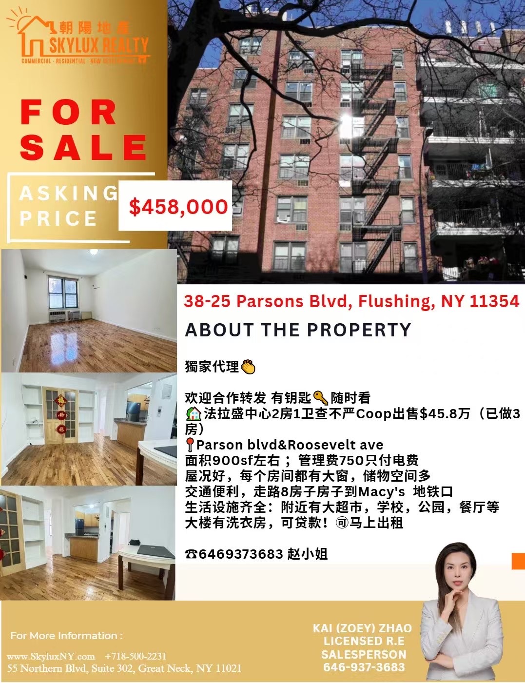 法拉盛两房康斗出售 学区优良 投资自住两相宜法拉盛电梯康斗出售 带储藏室与地下停车位[Party][Party]獨家代理, 周末公展🏅🏅欢迎合作转发 有钥匙🔑随时看🏡法拉盛中心2房1卫查不严Coop出售$45.8万(已做3房)📍Parson blvd&Roosevelt ave[玫瑰]面积900sf左右 ;管理费750只付电费[玫瑰]屋况好,每个房间都有大窗,储物空间多[玫瑰]交通便利,走路8房子房子到Macy's 地铁口[玫瑰]生活设施齐全:附近有大超市,学校,公园,餐厅等[玫瑰]大楼有洗衣房,可贷款!🉑马上出租☎6469373683 赵小姐