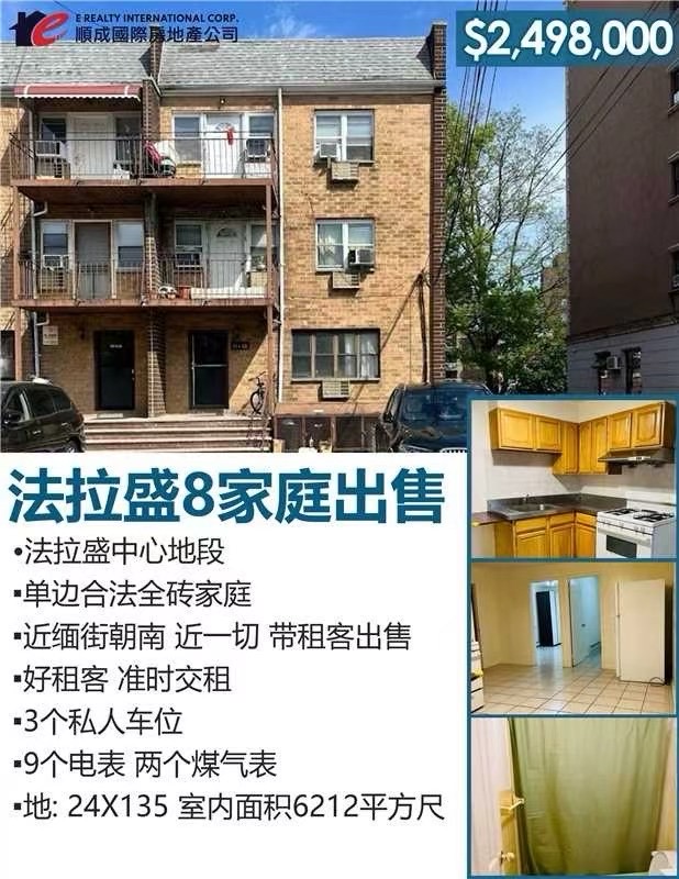 2025纽约法拉盛全新楼盘康斗出售 Flushing法拉盛最新新建康斗Condo 精装修 电梯楼 近地铁法拉盛华人购房首选 自住投资皆宜 学区房源热卖中地段优势 交通便捷 投资首选▪️法拉盛中心地段38Ave▪️单边合法全砖8⃣️家庭▪️近缅街朝南 近一切 带租客出售▪️好租客 准时交租▪️3个私人车位 ▪️9个电表 两个煤气表▪️地: 24X135; 室内面积6212平方尺 646 508 9880