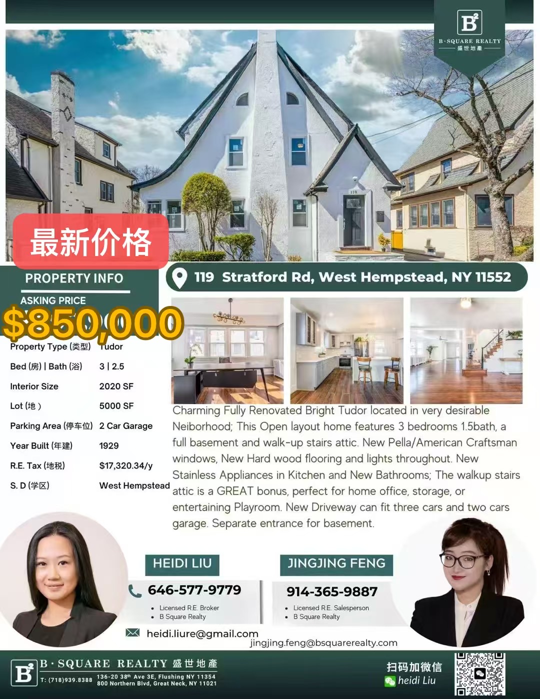 🔥独家代理 最新调价 🔥Hempstead亨普斯特德学区房出售 多户型适合华人投资买家long island长岛房子出售📍119 stratford rd, west hempstead 💰Asking 85万 🏡3房2.5万 2020尺 地5000尺 🏫学区 7/8/8 (白区不想太卷的可以来)🚖近adelphi university 距 LLIR 开车5分钟 💳Roosevelt field Mall, Costco 10分钟 🌟全新装修 全新地板和门窗 卫生间厨房 💠带新家具 可拎包入住🌸环境好 投资自住皆宜 ☎️Heidi Liu 646-577-9779☎️Jingjing Feng 914-365-9887🫶🏼欢迎合作转发🫱🏻🫲🏼