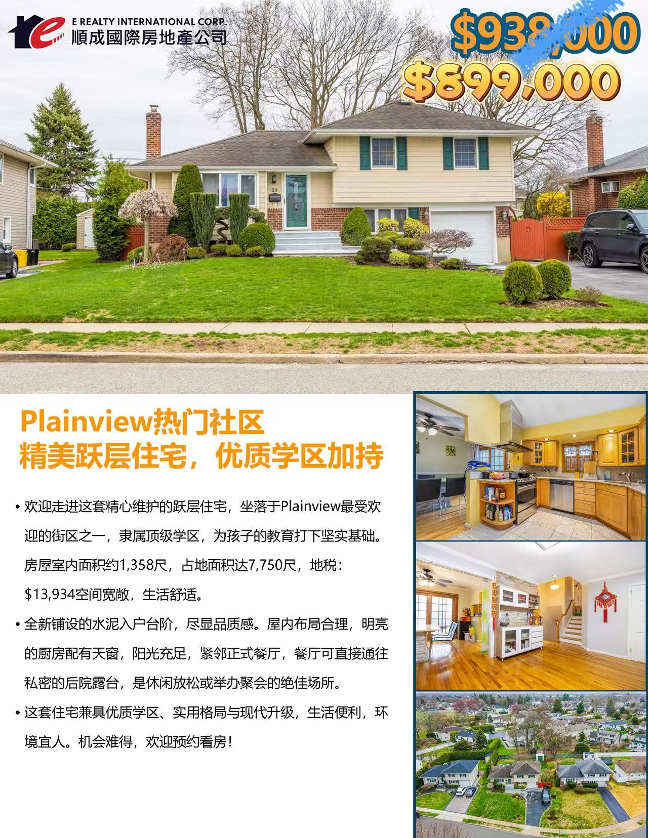 🎈欢迎走进这套精心维护的跃层住宅,坐落于Plainview最受欢迎的街区之一,3房1.5浴,隶属顶级学区,为孩子的教育打下坚实基础。房屋室内面积约1,358尺,占地面积达7,750尺,地税:$13,934.🎈全新铺设的大理石入户台阶,尽显品质感。屋内布局合理,明亮的厨房配有天窗,阳光充足,餐厅可直接通往私密的后院露台,是休闲放松或举办聚会的绝佳场所。完成地下室,独立超大全新车道🚗🎈这套住宅兼具优质学区、实用格局与现代升级,生活便利,环境宜人。机会难得,欢迎预约看房!售$899,000💰MLS#: 846768欢迎合作与转发🙏☎️Jc:646-708-2063