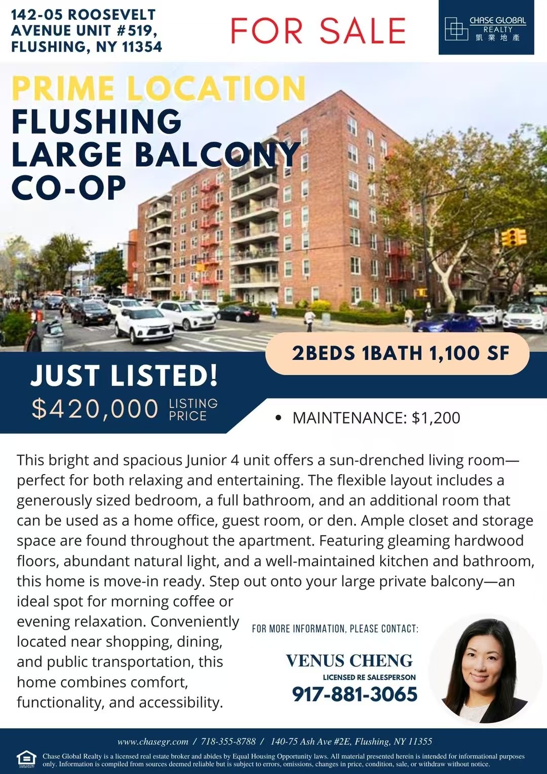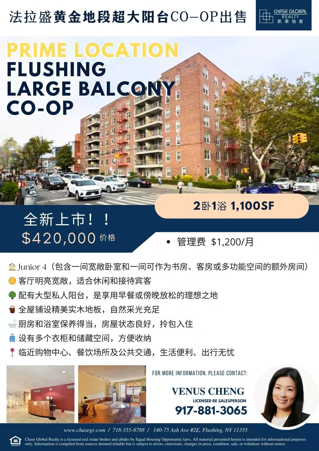 法拉盛电梯公寓出售 管理费低 自住出租两相宜法拉盛超值一卧公寓出售 华人买家首选 入门级投资好机会🔥凯业地产法拉盛黄金地段超大阳台Co-op出售🔥💰售价$420,000