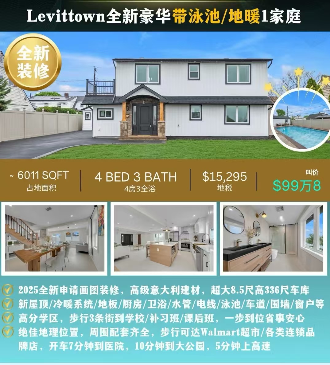 长岛Levittown莱维顿平价学区房出售 适合首次购房者与年轻家庭long island长岛房子出售💎Levittown 2025全新装修带泳池/地暖独栋1家庭✨豪宅配置,价格亲民!✨