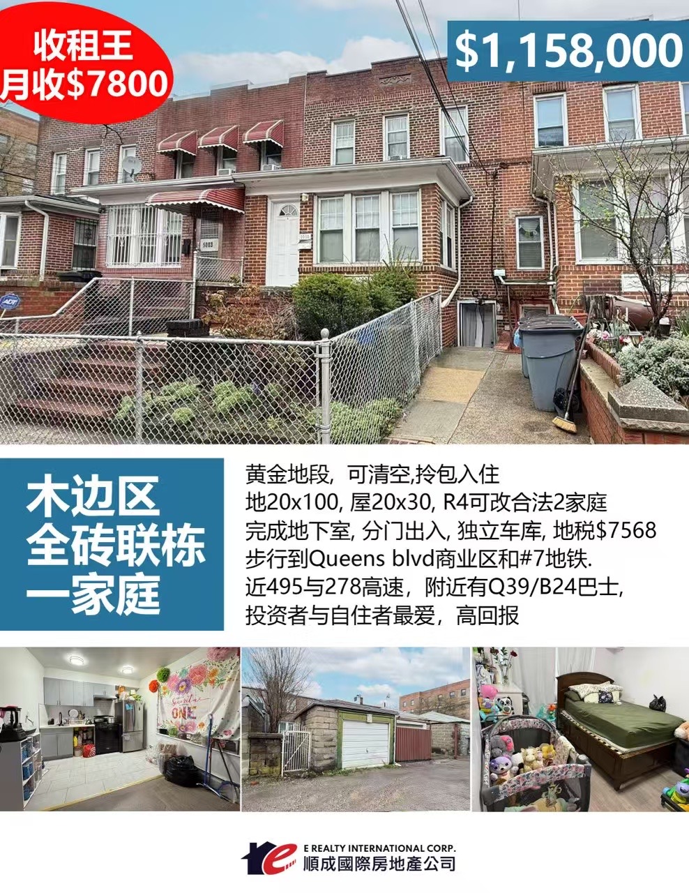 Woodside皇后区木边房子出售 Queens NY 公寓出租转售优质学区房 高回报投资热盘汇总🔥木边区全砖联栋一家庭🔥售价 $115萬8🔥收租王 月收$7800🌟黄金地段,可清空,拎包入住🌟地20x100,屋20x30,R4可改合法2家庭🌟完成地下室,分门出入,独立车库,地税$7568🌟步行到Queens blvd商业区和#7地铁,🌟近495与278高速,附近有Q39/B24巴士🌟投资者与自住者最爱,高回报347 399 5873